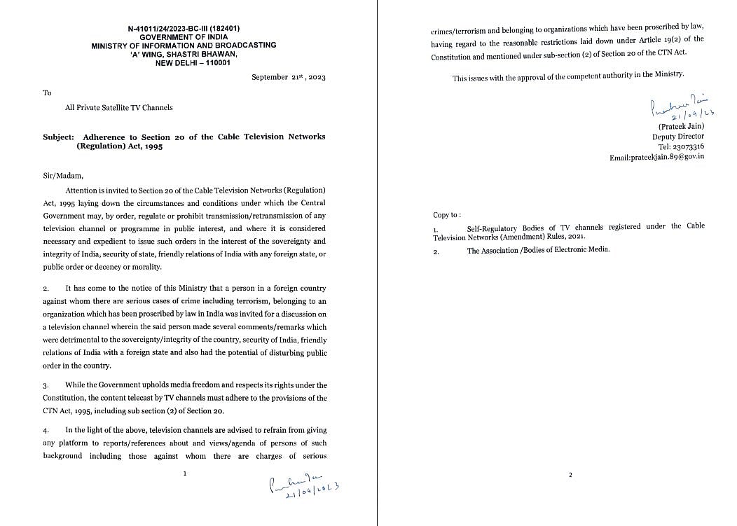 ഗുരുതരമായ കുറ്റകൃത്യങ്ങള്, തീവ്രവാദക്കുറ്റങ്ങള് എന്നിവ ചുമത്തപ്പെട്ടവര്, നിരോധിത സംഘടനകളില്പ്പെട്ടവര് എന്നിവരുമായി ബന്ധപ്പെട്ട റിപ്പോര്ട്ടുകളില് മുന്കരുതല് പാലിക്കണം. തീവ്രവാദം ഉള്പ്പെടെയുള്ള ഗുരുതരമായ കുറ്റകൃത്യങ്ങളില് ഉള്പ്പെടുകയും നിരോധിച്ചിട്ടുള്ള സംഘടനയില് അംഗവുമായ വിദേശരാജ്യത്തുള്ള ഒരു വ്യക്തിയെ ടെലിവിഷന് ചാനലില് ചര്ച്ചയ്ക്ക് ക്ഷണിച്ച സാഹചര്യം ശ്രദ്ധയില്പ്പെട്ടെന്ന് ചൂണ്ടിക്കാട്ടിയാണ് മന്ത്രാലയത്തിന്റെ നിര്ദേശം. ഈ പരിപാടിയില് പ്രസ്തുത വ്യക്തി രാജ്യത്തിന്റെ പരമാധികാരം/അഖണ്ഡത, ഇന്ത്യയുടെ സുരക്ഷ, വിദേശ രാജ്യവുമായുള്ള ഇന്ത്യയുടെ സൗഹൃദബന്ധം എന്നിവയ്ക്ക് ഹാനികരമായ നിരവധി പ്രസ്താവനകള് നടത്തുകയുണ്ടായെന്നും മന്ത്രാലയം വ്യക്തമാക്കുന്നു.