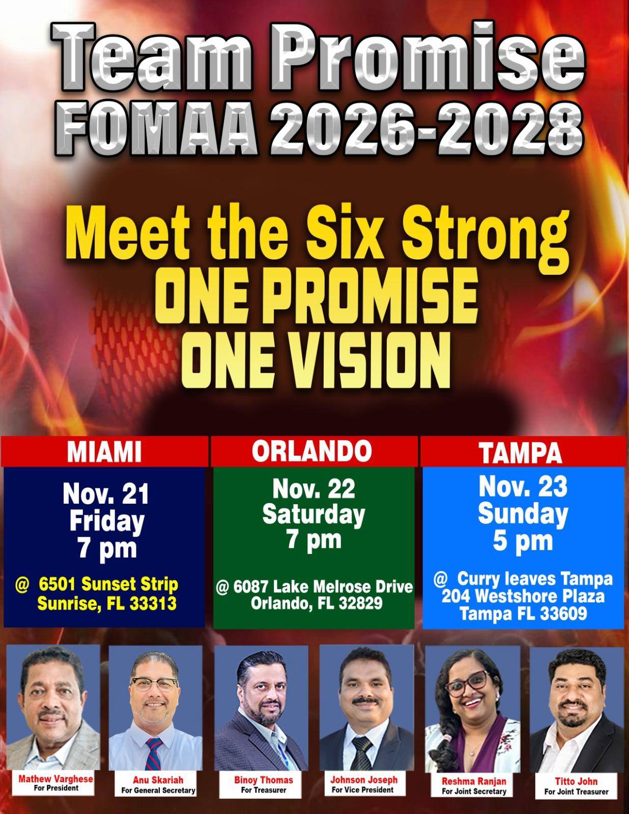വിശ്വസ്തത-സത്യസന്ധത-പ്രതിബദ്ധത-സുതാര്യത മുഖമുദ്രയാക്കി സംഘടനയുടെ യശസ്സ് കാത്തുസൂക്ഷിച്ചു പ്രവർത്തിക്കുമെന്ന പ്രഖ്യാപനവുമായി ഫോമാ തെരെഞ്ഞെടുപ്പിൽ മത്സരിക്കുന്ന മാത്യു വർഗീസ് നേതൃത്വം നൽകുന്ന ടീം പ്രോമിസിന്റ ഫ്ലോറിഡ പ്രചാരണയാത്രക്ക് നവംബർ 21 വെള്ളിയാഴ്ച്ച മയാമിയിൽ തുടക്കം കുറിക്കും. മാത്യു വർഗീസ് - പ്രസിഡന്റ് , അനു സ്കറിയ -സെക്രട്ടറി, ബിനോയ് തോമസ് - ട്രഷറർ , ജോൺസൺ ജോസഫ് - വൈസ് പ്രസിഡന്റ് , രേഷ്മ രഞ്ജൻ - ജോയിൻറ് സെക്രട്ടറി, ടിറ്റോ ജോൺ - ജോയിന്റ് ട്രഷറർ എന്നിവരാണ് ടീം പ്രോമിസ് സ്ഥാനാർത്ഥികൾ .