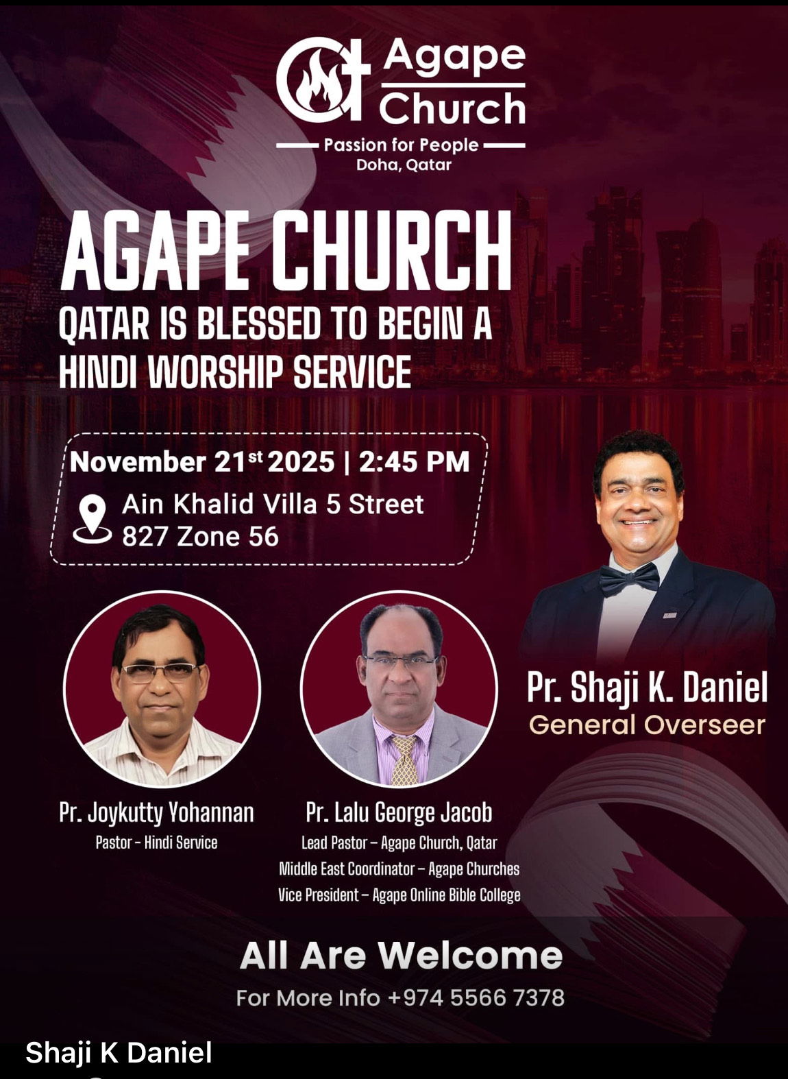 ദോഹ, ഖത്തര്: അഗാപേ ചര്ച്ച്, ദോഹ, ഖത്തര് തങ്ങളുടെ പുതിയ ഹിന്ദി ആരാധന ആരംഭിക്കുന്നതായി അറിയിച്ചു. പ്രവാസികളായ ഹിന്ദി സംസാരിക്കുന്നവര്ക്ക് ആത്മീയമായി ഒത്തുചേരാന് അവസരം നല്കുക എന്ന ലക്ഷ്യത്തോടെയാണ് ഈ പുതിയ സംരംഭം.