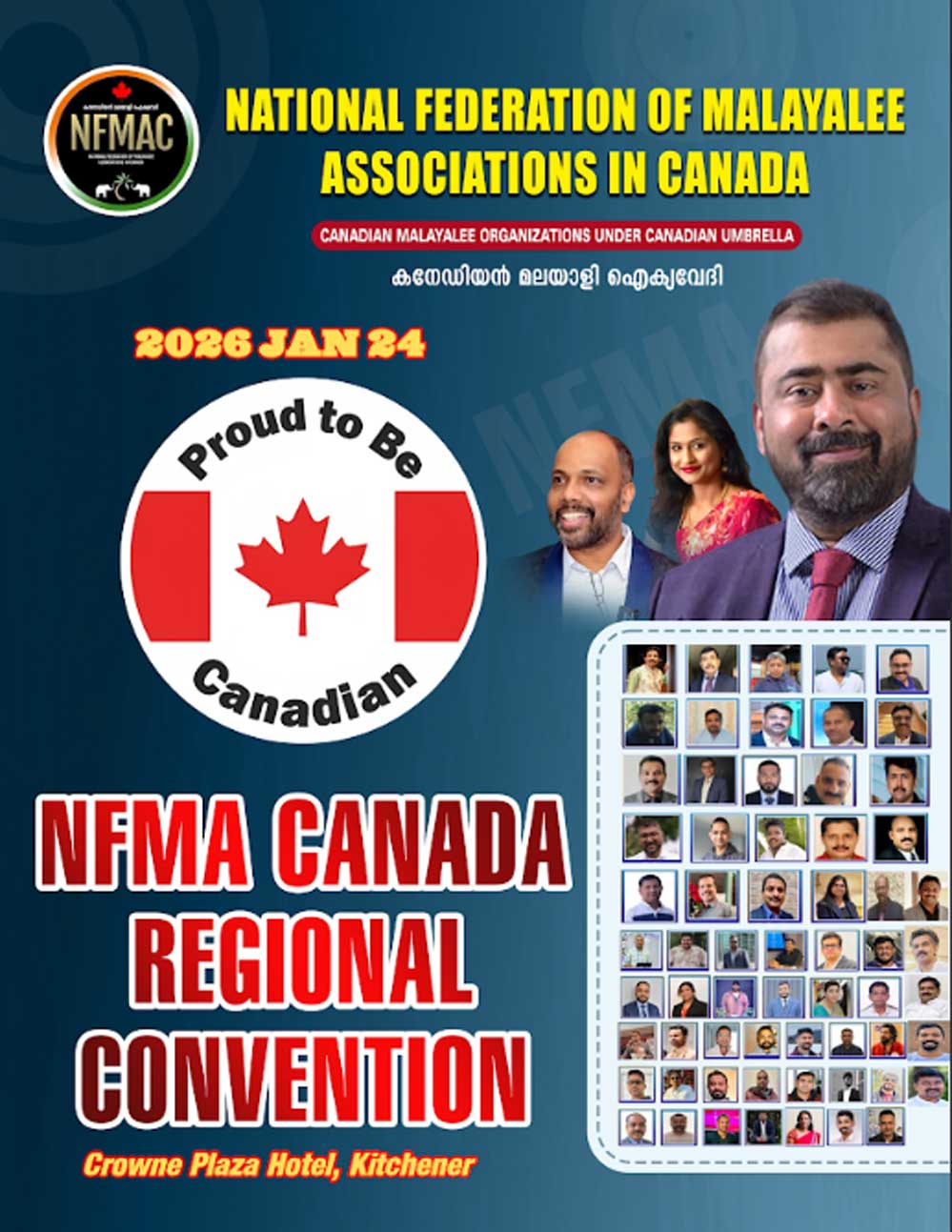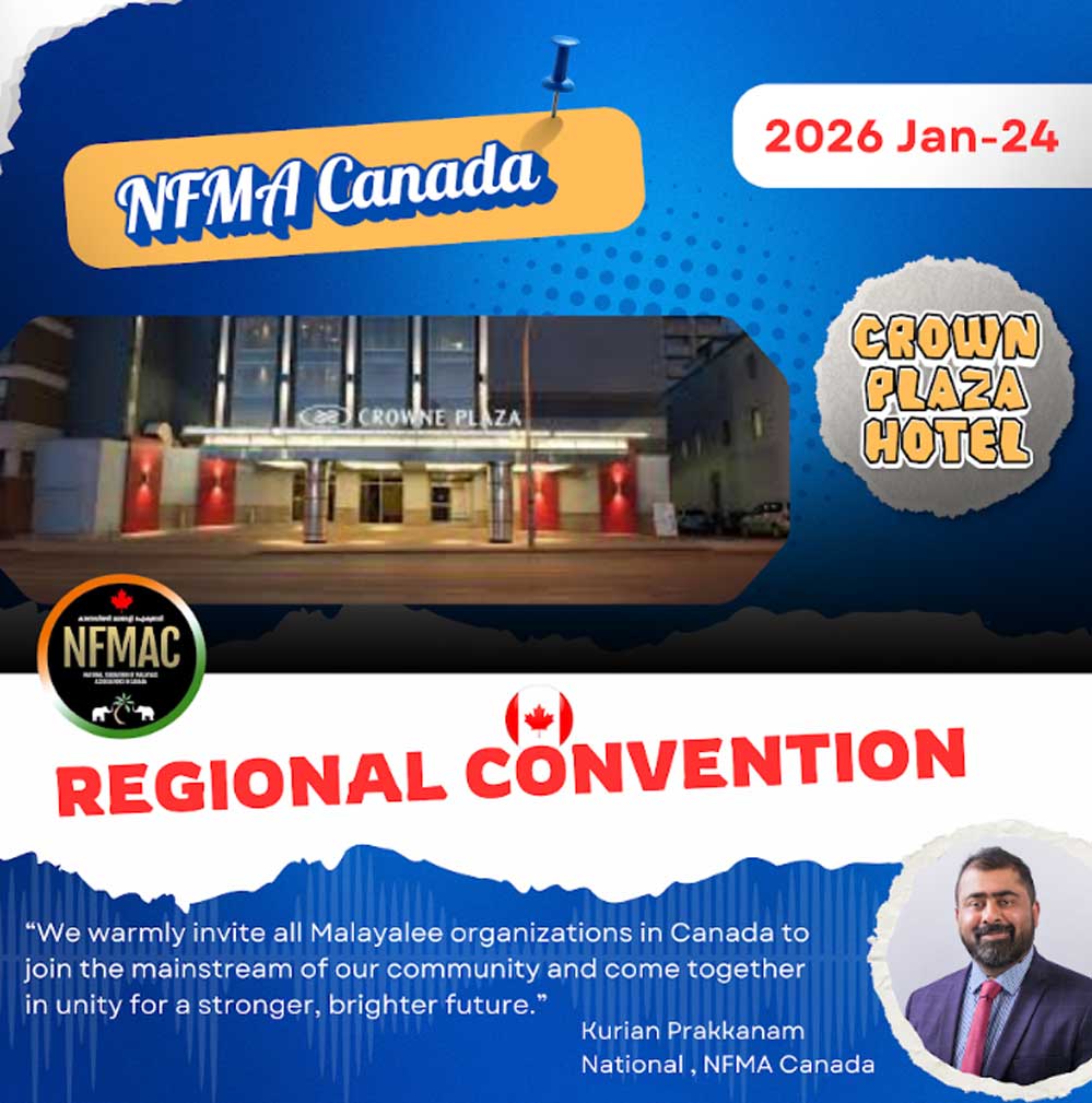 കാനഡയിലെ മലയാളി സംഘടനകളുടെ ദേശീയ കൂട്ടായ്മയായ NFMA canada പൂതു ചരിത്രത്തിലേക്ക്. കാനഡയിലെ വലുതും ചെറുതുമായ സംഘടനകളെ എല്ലാം ഒരു കുടകീഴിൽ കോര്ത്തിണക്കി രൂപീകൃതമായ NFMAC കാനഡ എന്ന സംഘടന അതിന്റെ ചരിത്ര പരമായ ചുവടു വെയ്പ്പിലേക്ക് നീങ്ങുന്നു . ചരിത്രത്തിലാധ്യമായി ഒന്റാരിയൊ പ്രൊവിന്സില് എന് എഫ് എം എ റീജിനല് കണ്വെന്ഷന് സംഘടിപ്പിക്കുന്നു. കിച്ചനറിലെ ക്രൌണ് പ്ലാസ്സാ ഹോട്ടലില് വെച്ചാണ് 2026 ജനുവരി 24 നു സംഘടനയുടെ ആദ്യ റീജിനല് കണ്വെന്ഷന് നടക്കുന്നത്. ഏതാനും വര്ഷങ്ങള്ക്ക് മുന്പ് പത്മശ്രീ ഡോ എം എ യൂസഫലി ഓണ്ലൈന് ആയി സംഘടനയുടെ ഉത്ഘാടനം നിര്വഹിച്ചെങ്കിലും ഇതാദ്യമായാണ് സംഘടനകള് ഒത്തോടൊമിച്ചു ഒരു കണ്വെന്ഷനു തയ്യാറാകുന്നത്