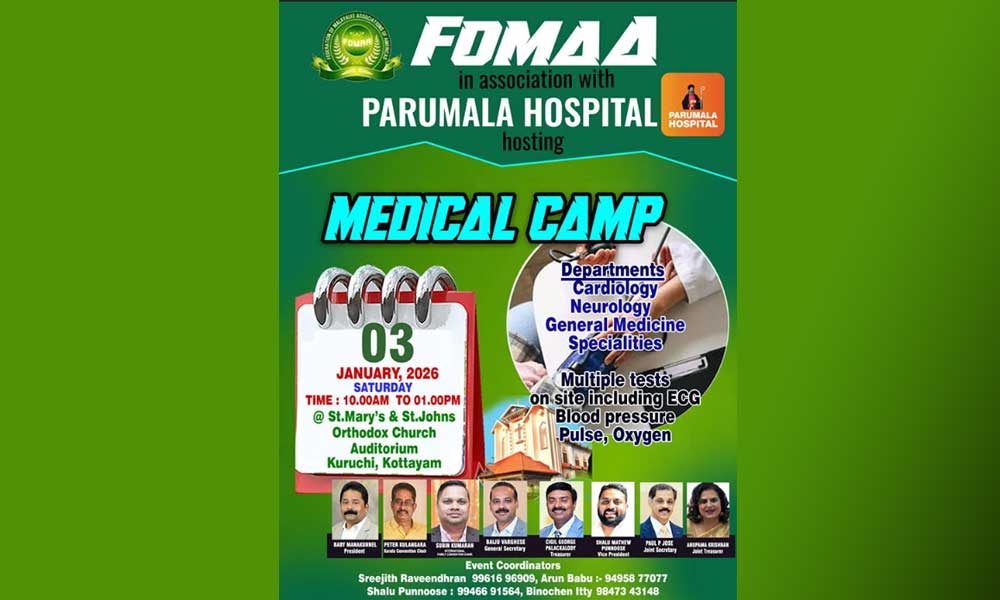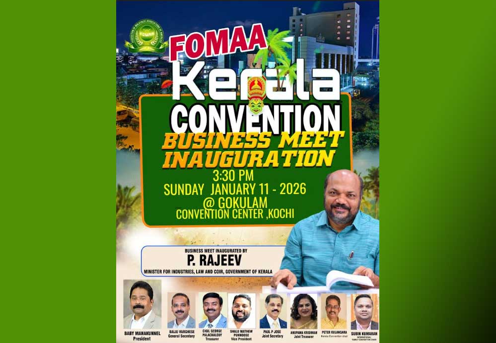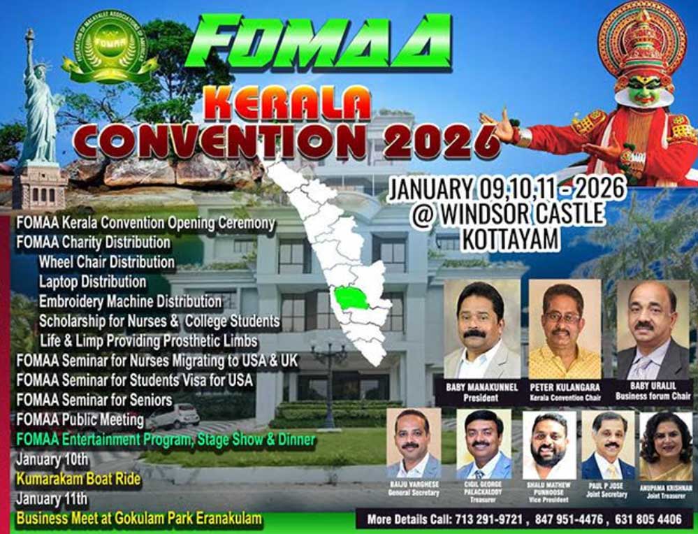 കോട്ടയം: അമേരിക്കന് മലയാളികളുടെ ഏറ്റവും വലിയ ഫെഡറേഷനായ ഫോമായുടെ കുടുംബാംഗങ്ങള് വീണ്ടും ജന്മനാട്ടിലേയ്ക്കെത്തി നൊസ്റ്റാള്ജിയയുടെ പൂമുഖത്തൊരു നിലവിളക്കുകൊളുത്തി ഗൃഹപ്രവേശനത്തിനൊരുങ്ങുകയാണ്. മഹത്തായ ജീവകാരുണ്യ പദ്ധതികളുടെ ഭാഗമായുള്ള വിവിധ സഹായ വിതരണമുള്പ്പെടെ ഫോമായുടെ ചരിത്രത്തില് അടയാളപ്പെടുത്തുന്ന കേരള കണ്വന്ഷനോടനുബന്ധിച്ചുള്ള ബഹുമുഖ പരിപാടികള് 2026 ജനുവരി 3-ാം തീയതി പരുമല സെന്റ് ഗ്രിഗോറിയോസ് മെഡിക്കല് മിഷന് മള്ട്ടി സ്പെഷ്യാലിറ്റി ആശുപത്രിയുമായി സഹകരിച്ച് നടത്തുന്ന മെഡിക്കല് ക്യാമ്പോടെ തുടക്കം കുറിക്കുമെന്ന് ഫോമാ പ്രസിഡന്റ് ബേബി മണക്കുന്നേല് അറിയിച്ചു.
