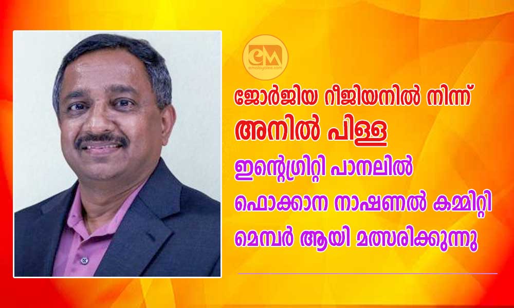 ജോർജിയ റീജിയനിൽ നിന്ന് അനിൽ പിള്ള ഇന്റെഗ്രിറ്റി പാനലിൽ നാഷണൽ കമ്മിറ്റി മെമ്പർ ആയി മത്സരിക്കുന്നു