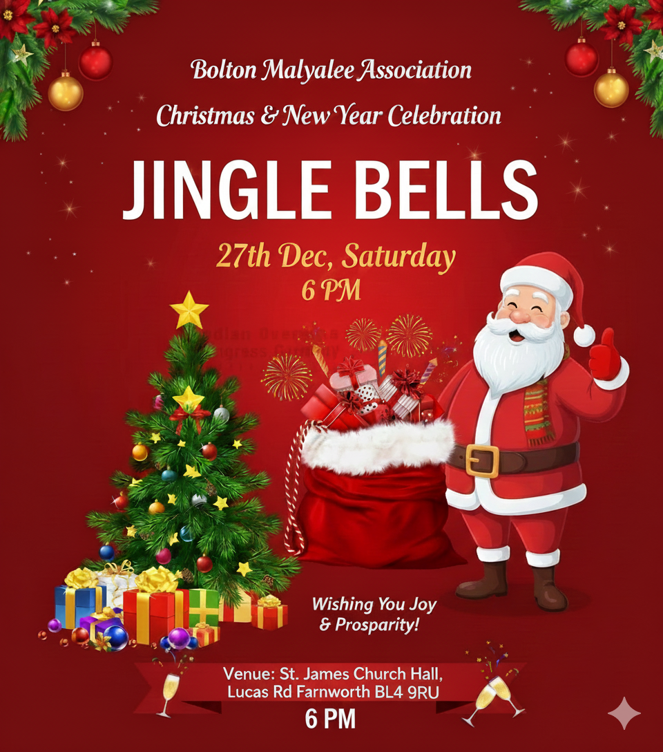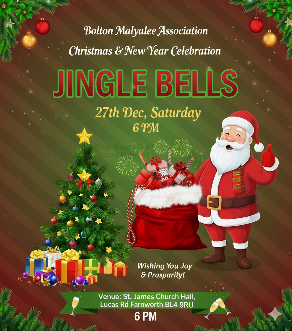 ബി എം എയുടെ ക്രിസ്മസ് - പുതുവത്സര ആഘോഷങ്ങൾ 'ജിംഗിൾ ബെൽസ്' ഡിസംബർ 27 ശനിയാഴ്ച ഫാൻവർത്ത് സെന്റ്. ജയിംസ് ചർച്ച് ഹാളിൽ വച്ചു വൈവിധ്യമാർന്ന പരിപാടികളോടെ സംഘടിപ്പിക്കും. വൈകിട്ട് 6 മണിയോടെ ആഘോഷപരിപാടികളുടെ തിരി തെളിയും.