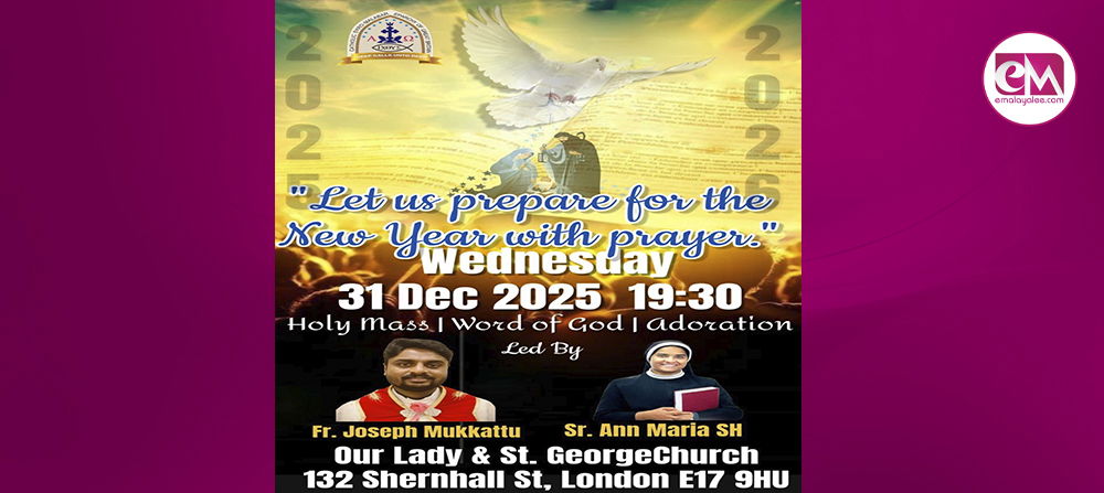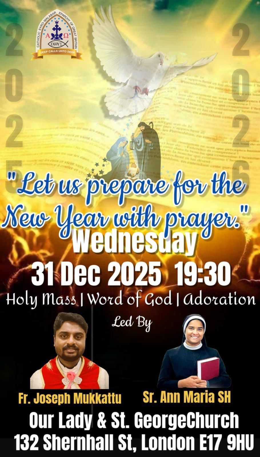 ലണ്ടന്: ഗ്രേറ്റ് ബ്രിട്ടന് സീറോ മലബാര് ഇവാഞ്ചലൈസേഷന് കമ്മീഷന്, ലണ്ടന് റീജിയന്റെ നേതൃത്വത്തില്, ഡിസംബര് 31 നു വാള്ത്തംസ്റ്റോവില് കൃതജ്ഞതാബലിയും, പുതുവത്സര സമര്പ്പണ ശുശ്രുഷകളും സംഘടിപ്പിക്കുന്നു.