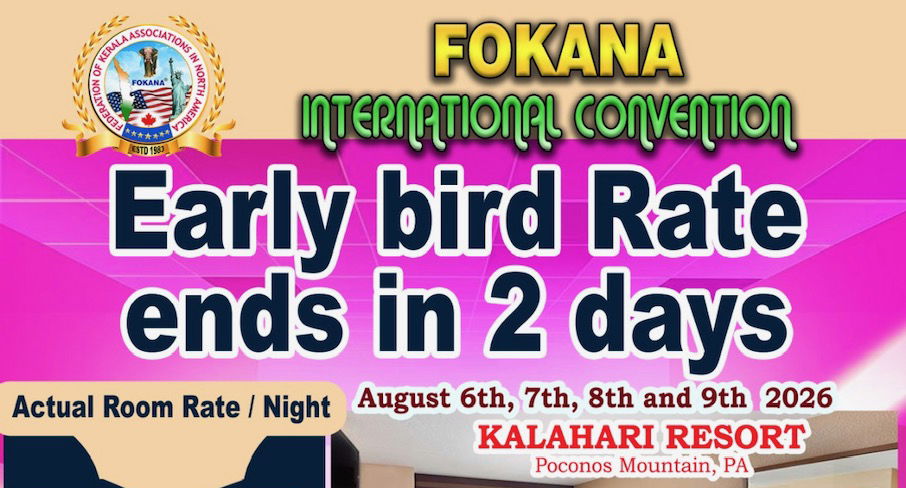 കൂടുതൽ ആളുകളെ പങ്കെടുപ്പിച്ചു ഒരു ചരിത്ര കൺവെൻഷൻ ആക്കുവാൻ ആണ് ഫൊക്കാന ശ്രമിക്കുന്നത്. ഈ ഡിസ്കൗണ്ട് റേറ്റ് എല്ലാവരും പ്രയോജനപെടുത്തും എന്ന് ഫൊക്കാന കമ്മിറ്റി ആഗ്രഹിക്കുന്നു. വളരെ കുറച്ചു റൂമുകൾ മാത്രമേ ഇനിയും അവശേഷിക്കുന്നുള്ളൂ , അതുകൊണ്ട് എത്രയും പെട്ടെന്ന് രെജിസ്റ്റർ ചെയ്തു നിങ്ങളുടെ രെജിസ്ട്രേഷൻ സേഫ് ആക്കണണമെന്നും ഈ ചരിത്ര കൺവെൻഷൻ നടക്കുബോൾ നിങ്ങളും അതിൽ ഒരു ഭാഗമാകുവാൻ ഞങ്ങൾ ആഗ്രഹിക്കുന്നതായി പ്രസിഡന്റ് സജിമോൻ ആന്റണിയും ഫൊക്കാന കമ്മിറ്റിയും അറിയിച്ചു.