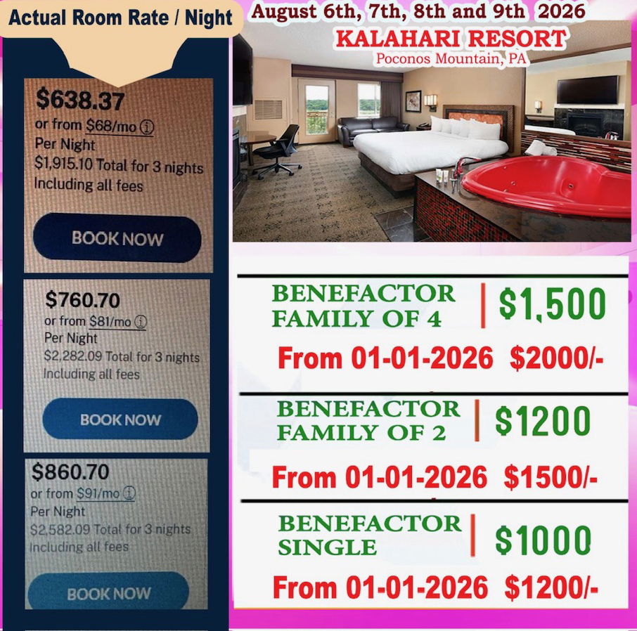 രജിസ്ട്രേഷൻ രണ്ടു പേർക്ക് $1200 ഉം ,നാലു പേർ അടങ്ങുന്ന ഫാമിലിക്ക് (അച്ഛനമ്മമാർ രണ്ടു കുട്ടികൾ )$ 1500 .00 ഡോളർ ആണ്. നാലായിരം ഡോളർ ചെലവുള്ള ഫാമിലി രെജിസ്ട്രേഷൻ ആണ് ആയിരത്തി അഞ്ഞുറു ഡോളറിന് നൽകുന്നത്.ഓർക്കുക കലഹരിയിലെ ഓഗസ്റ്റിലെ ബേസിക് റൂം റേറ്റ് 690 മുതൽ 755 വരെ ആണ് അതിൽ ഫുഡ് ഉൾപ്പെടുന്നില്ല. കാലഹരി റിസോർട്ടിന്റെ വെബ്സൈറ്റിൽ പോയി ഓഗസ്റ്റിലെ റേറ്റ് നോക്കിയാൽ നമ്മൾ റേറ്റ് കണ്ടു അതിശയിച്ചുപോകും . അതാണ് മുന്ന് രാത്രിക്കും നാല് പകലിനും $ 1500 ന് ഡിസംബർ 31 ,2025 വരെ നൽകുന്നത്. അതിന് ശേഷം 1200 എന്നുള്ളത് 1500 ,1500 എന്നുള്ളത് 2000 എന്ന ക്രമത്തിൽ വർദ്ധിക്കുന്നതാണ്.