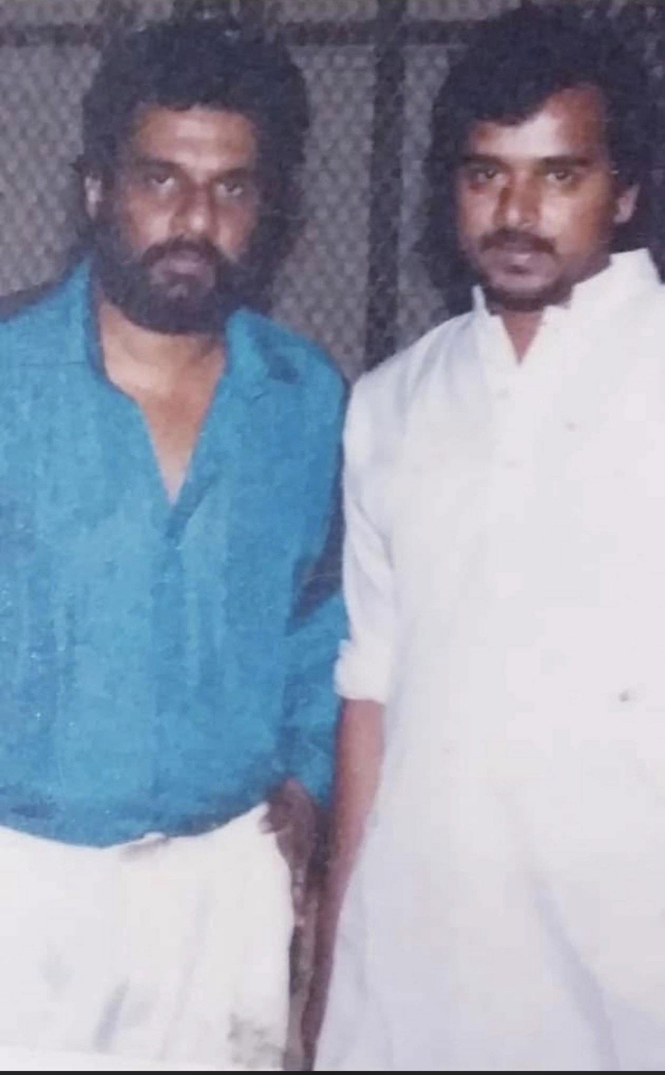 പതിവു തൂവെള്ള വസ്ത്രത്തിനു പകരം, നീലഷര്ട്ടു ധരിച്ച ദാസേട്ടനോടൊപ്പം ലേഖകന്-ഒരു പഴയ ചിത്രം.