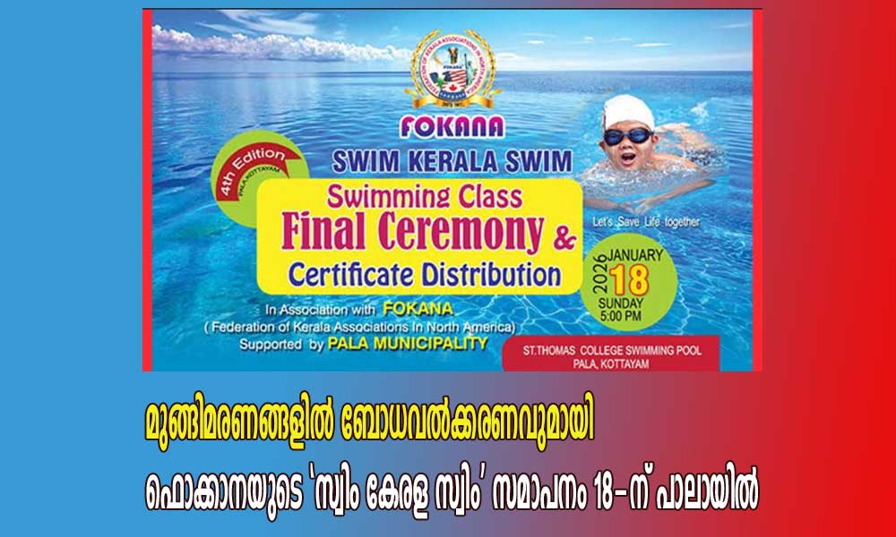 കോട്ടയം: ഫൊക്കാന, വൈക്കം ആസ്ഥാനമായുള്ള മൈല് സ്റ്റോണ് സ്വിമ്മിങ് പ്രമോട്ടിങ് ചാരിറ്റബിള് സൊസൈറ്റിയും (എം.എസ്.പി.എസ്) പാലാ മുനിസിപ്പാലിറ്റിയുമായി കൈകോര്ത്ത് സംഘടിപ്പിക്കുന്ന 'സ്വിം കേരള സ്വിം' പദ്ധതിയുടെ നാലാംഘട്ട സൗജന്യ നീന്തല് പരിശീലത്തിന്റെ സമാപന സമ്മേളനവും സര്ട്ടിഫിക്കറ്റ് വിതരണവും വരുന്ന 18-ാം തീയതി ഞായറാഴ്ച വൈകുന്നേരം അഞ്ചു മണിക്ക് പാലാ സെന്റ് തോമസ് കോളേജ് സ്വിമ്മിങ് പൂളില് നടക്കുമെന്ന് ഫൊക്കാന പ്രസിഡന്റ് സജിമോന് ആന്റണി അറിയിച്ചു.