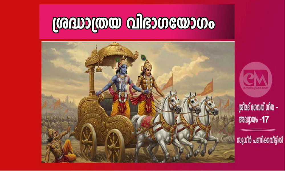 ഇത് പതിനേഴാമത്തെ അധ്യായം. ഭഗവത്ഗീത മൊത്തം പതിനെട്ട് അധ്യായങ്ങളാണ്. ഈ അധ്യായം ശ്രദ്ധാത്രയ വിഭാഗയോഗം എന്നാണറിയപ്പെടുന്നത്. ശ്രദ്ധാത്രയ എന്ന് പറഞ്ഞാൽ മൂന്നു തരത്തിലുള്ള ശ്രദ്ധ. ശ്രദ്ധ എന്ന പദം കൊണ്ട് ഉദ്ദേശിക്കുന്നത് ഏകാഗ്രതയല്ല മറിച്ച് വിശ്വാസദാർഢ്യമാണ്. പ്രകൃതിയുടെ ഗുണങ്ങളായ സാത്വതികം, രജസ്സ്, തമസ്സ് എന്നിവയിൽ നിന്നുണ്ടാകുന്ന മൂന്നു തരത്തിലുള്ള വിശ്വാസങ്ങളെയാണ് ശ്രദ്ധത്രയാ എന്ന് പറയുന്നത്. ഈ വിശ്വാസങ്ങളിൽ നിന്നുകൊണ്ട് എങ്ങനെയാണ് ആളുകൾ പ്രവർത്തിക്കുന്നത് എന്നതിനെ വിശദീകരിക്കയാണ് ഭഗവാൻ. പതിനാറാം അധ്യായം ഭഗവൻ അവസാനിപ്പിക്കുന്നത് ഇങ്ങനെ പറഞ്ഞിട്ടാണ്. യാതൊരുവൻ ശാസ്ത്രവിധി മാനിക്കാതെ സ്വന്തം ഇഷ്ടം പോലെ ഓരോന്ന് പ്രവർത്തിക്കുന്നുവോ അവനു ജയം ഉണ്ടാകുന്നില്ല. സുഖമോ പരമഗതിയോ അവനു ലഭിക്കുന്നില്ല. അപ്പോൾ അർജുനന്റെ സംശയം ശാസ്ത്രവിധിപ്രകാരമല്ലാതെ മറ്റ് എന്തിനെയെങ്കിലും വിശ്വാസത്തോടെ അനുഗമിക്കുന്നവർ ഏതു വിഭാഗത്തിൽ പെടുമെന്നാണ്. ഈ അധ്യായത്തിൽ പ്രസ്തുത മൂന്നു ഗുണങ്ങൾ ഒരാളുടെ വിശ്വാസത്തെയും, ആരാധനാക്രമത്തെയും, ആഹാരത്തെയും, ദാനധർമ്മങ്ങളെയും, തപശ്ചര്യകളെയും,എങ്ങനെ ബാധിക്കുവെന്നും, അവസാനമായി ശ്രദ്ധയില്ലാതെ ചെയുന്ന ഹോമവും, ദാനവും തപസ്സും, ബാക്കി എന്തെല്ലാമോ അതൊക്കെയും അസത്താണെന്നും ഭഗവാൻ പറയുന്നു.