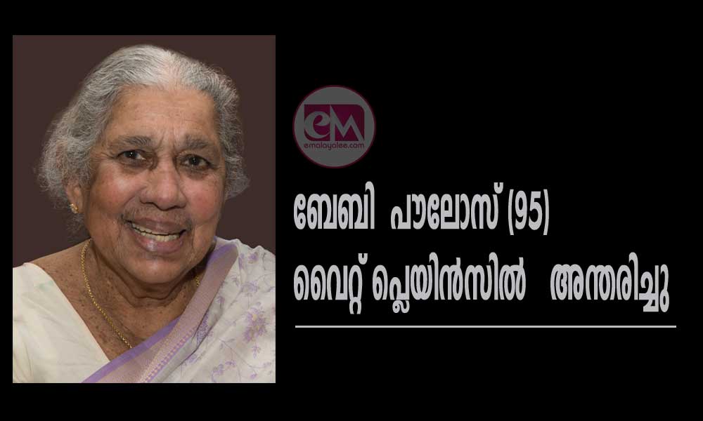 ന്യൂയോർക് :എറണാകുളം തിരുവാണിയൂർ പാലാൽ കളപാട്ടിൽ ബേബി പൗലോസ് (95) വൈറ്റ് പ്ലെയിൻസിൽ അന്തരിച്ചു. പരേതനായ കെ എ പൗലോസ് മാഷിൻറെ ഭാര്യയാണ്. പരേത പോർട്ചെസ്റ്റർസെന്റ് ജോർജ് ഓർത്തഡോൿസ് പള്ളി അംഗമാണ്.