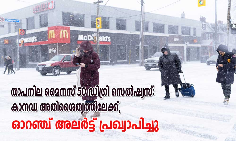 ടൊറന്റോ: രാജ്യത്തെ വിവിധ പ്രദേശങ്ങളിൽ താപനില മൈനസ് 50 ഡിഗ്രി സെൽഷ്യസ് വരെ എത്തുമെന്ന് കാലാവസ്ഥാനിരീക്ഷണ കേന്ദ്രം മുന്നറിയിപ്പ് നൽകി. അസ്ഥി മരവിപ്പിക്കുന്ന തണുപ്പ് അനുഭവപ്പെടുന്നതിനാൽ സസ്കാച്വാൻ, മാനിറ്റോബ എന്നിവിടങ്ങളിലും വടക്കൻ ഒൻ്റാരിയോയുടെ മിക്ക ഭാഗങ്ങളിലും എൻവയൺമെൻ്റ് കാനഡ ഓറഞ്ച് അലർട്ട് നൽകിയിട്ടുണ്ട്. അതിശൈത്യകാലാവസ്ഥ കാര്യമായ നാശനഷ്ടങ്ങൾ, തടസ്സങ്ങൾ, ആരോഗ്യ പ്രശ്നങ്ങൾ എന്നിവയ്ക്ക് കാരണമാകുമെന്നും ഏജൻസി പറയുന്നു.