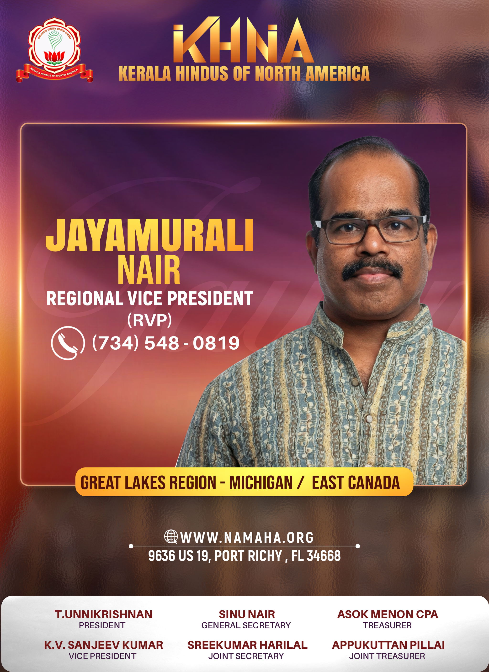 മിഷിഗൺ: മിഷിഗണിലെ മലയാളി സമൂഹത്തിൽ സാംസ്കാരികവും ആത്മീയവുമായ രംഗങ്ങളിൽ സജീവ സാന്നിധ്യമായ ജയമുരളി നായരെ, കേരള ഹിന്ദൂസ് ഓഫ് നോർത്ത് അമേരിക്ക (KHNA) യുടെ ഗ്രേറ്റ് ലേക്സ് റീജിയണൽ വൈസ് പ്രസിഡന്റായി തിരഞ്ഞെടുത്തു. മിഷിഗൺ, ഈസ്റ്റ് കാനഡ എന്നിവ ഉൾപ്പെടുന്ന മേഖലകളുടെ സംഘടനാപരമായ ഏകോപന ചുമതലയാണ് അദ്ദേഹം വഹിക്കുക.