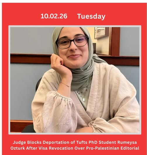 മസാച്യുസെറ്റ്സ് : പാലസ്തീന് അനുകൂല നിലപാട് സ്വീകരിച്ചതിന്റെ പേരില് ട്രമ്പ് ഭരണകൂടം തടങ്കലിലാക്കിയ ടഫ്റ്റ്സ് സര്വകലാശാലയിലെ ഗവേഷക വിദ്യാര്ത്ഥിനി റുമൈസ ഓസ്തുര്ക്കിനെ നാടുകടത്താനുള്ള നീക്കം ഇമിഗ്രേഷന് കോടതി തടഞ്ഞു. ഓസ്തുര്ക്കിനെ നാടുകടത്താന് ആവശ്യമായ തെളിവുകള് ഹാജരാക്കുന്നതില് ആഭ്യന്തര സുരക്ഷാ വകുപ്പ് പരാജയപ്പെട്ടുവെന്ന് ചൂണ്ടിക്കാട്ടിയാണ് കോടതി നടപടികള് അവസാനിപ്പിച്ചത്.