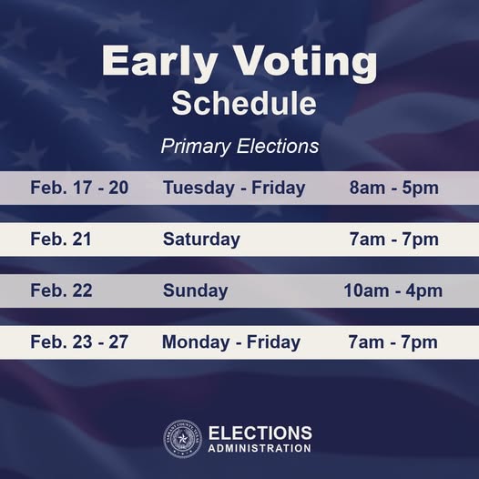 ഓസ്റ്റിന് : ടെക്സസ് പ്രൈമറി തിരഞ്ഞെടുപ്പിന്റെ ആദ്യഘട്ട വോട്ടെടുപ്പ് (Early Voting) ചൊവ്വാഴ്ച ആരംഭിച്ചു. മാര്ച്ച് 3-നാണ് ഔദ്യോഗിക തിരഞ്ഞെടുപ്പ് ദിവസം. ഒരു സ്ഥാനാര്ത്ഥിക്കും 50%-ലധികം വോട്ട് ലഭിച്ചില്ലെങ്കില് മേയ് 26-ന് രണ്ടാം ഘട്ട വോട്ടെടുപ്പ് (Runoff) നടക്കും.