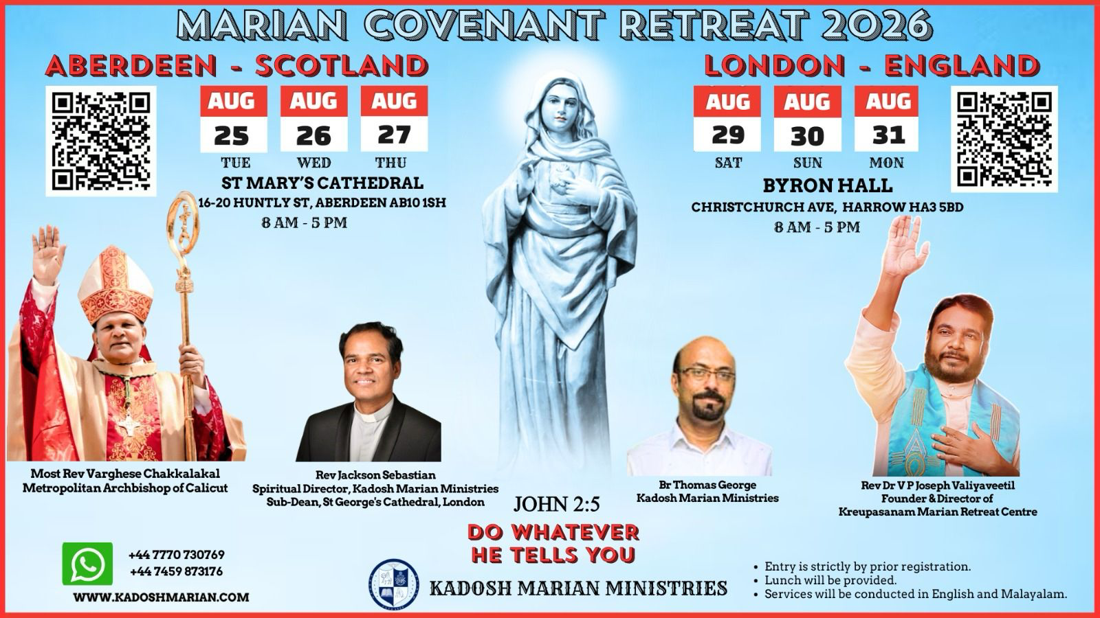 കൃപാസനം മരിയൻ ഉടമ്പടി ധ്യാനത്തിൽ പങ്കെടുക്കുവാൻ ലഭിക്കുന്ന ഈ അവസരം ഉപയോഗിക്കുവാനും, അനുഗ്രഹങ്ങളുടെ വാതായനങ്ങൾ തുറന്നു കിട്ടുന്ന തിരുവചന ശുശ്രൂഷയിലും തിരുക്കർമ്മങ്ങളിലും പങ്കുചേരുവാനും, കാദോഷ് മരിയൻ മിനിസ്ട്രീസ് ഏവരെയും സ്നേഹപൂർവ്വം ക്ഷണിക്കുന്നു. പങ്കെടുക്കുവാൻ ആഗ്രഹിക്കുന്നവർ മുൻകൂറായി പേരുകൾ രെജിസ്റ്റർ ചെയ്തു സീറ്റുകൾ ഉറപ്പാക്കുവാൻ അഭ്യർത്ഥിക്കുന്നു.
