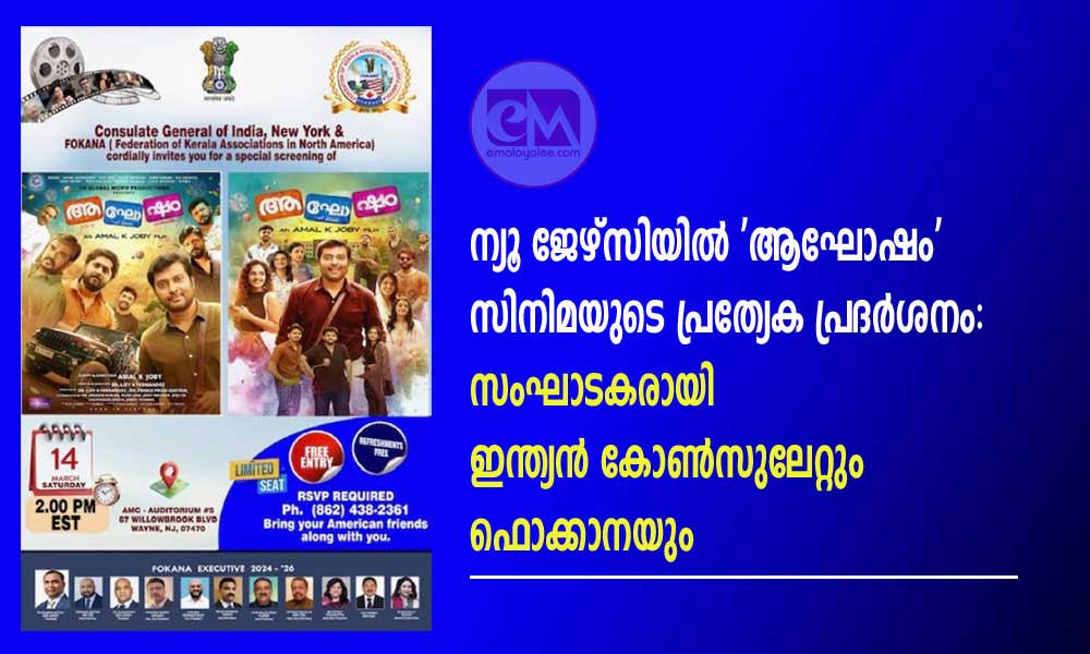ന്യൂ ജേഴ്സിയിൽ ‘ആഘോഷം’ സിനിമയുടെ പ്രത്യേക പ്രദർശനം | ‘Aghosham’ Special Screening in NJ– March 14