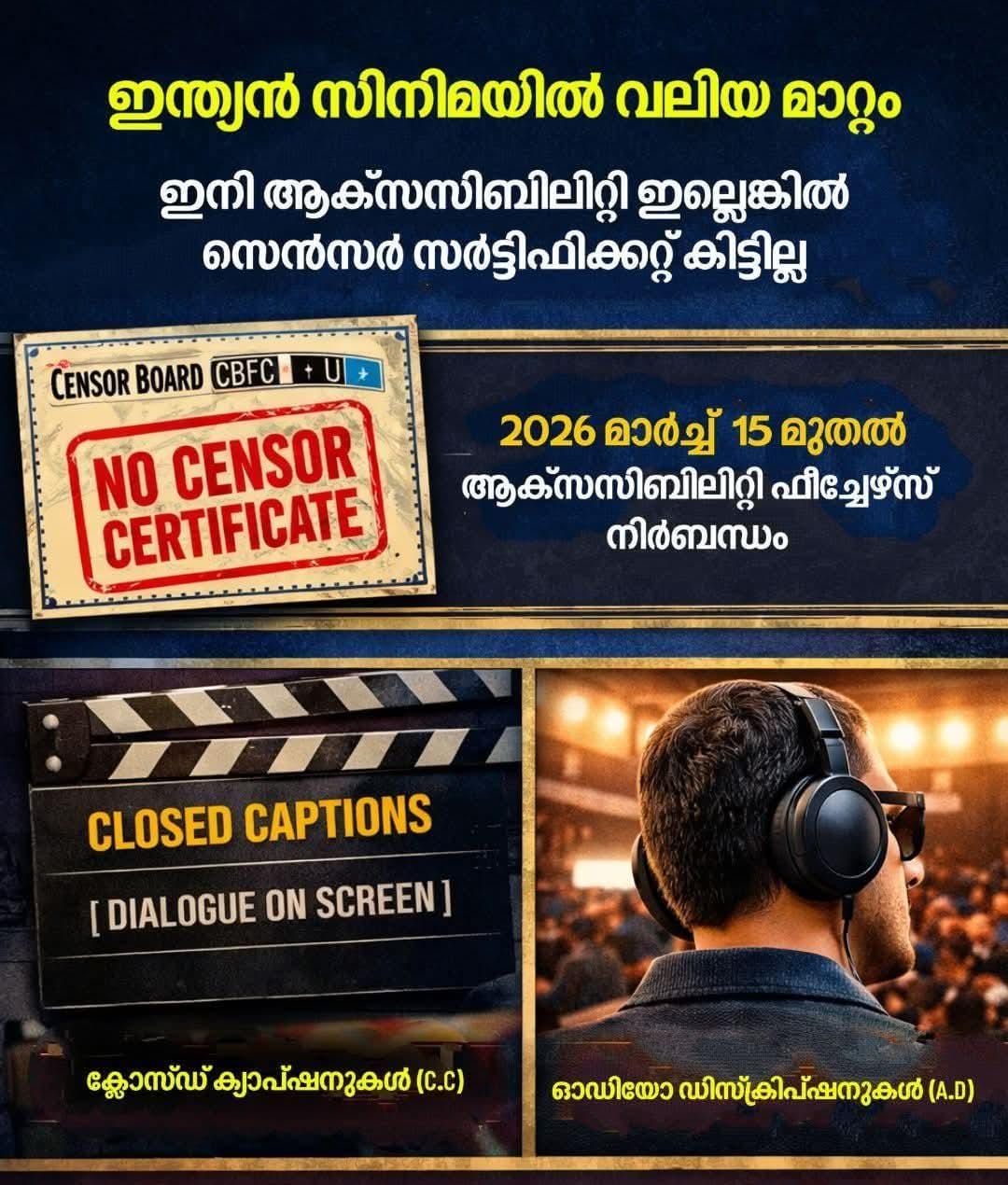 ഇപ്പോൾ, സെൻട്രൽ ബോർഡ് ഓഫ് ഫിലിം സർട്ടിഫിക്കേഷൻ (CBFC) കൊണ്ടുവരുന്ന പുതിയ നിയമം സിനിമകളുടെ റിലീസ് രീതികളിൽ വലിയ മാറ്റമുണ്ടാക്കാൻ പോകുകയാണ്. 2026 മാർച്ച് 15 മുതൽ, സർട്ടിഫിക്കേഷനായി അപേക്ഷിക്കുന്ന എല്ലാ സിനിമകളിലും 'അക്സസിബിലിറ്റി' (Accessibility) ഫീച്ചറുകൾ നിർബന്ധമായും ഉൾപ്പെടുത്തിയിരിക്കണം. ഈ നിബന്ധനകൾ പാലിക്കാത്ത പക്ഷം സിനിമയ്ക്ക് സെൻസർ സർട്ടിഫിക്കറ്റ് ലഭിക്കില്ല. പ്രാദേശിക സിനിമകൾ മുതൽ വലിയ ബോളിവുഡ് ചിത്രങ്ങളെ വരെ ഈ നിയമം ബാധിക്കും.
