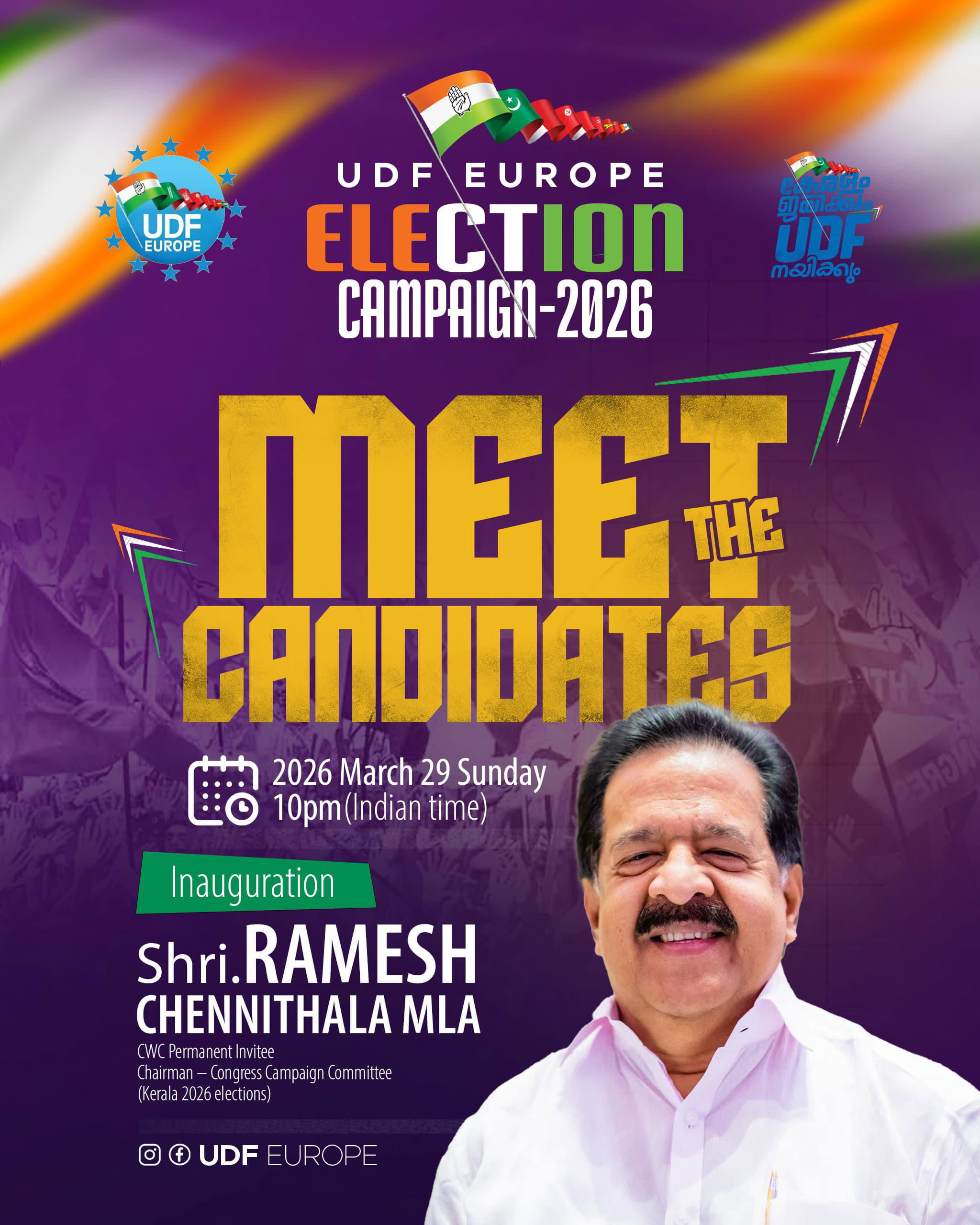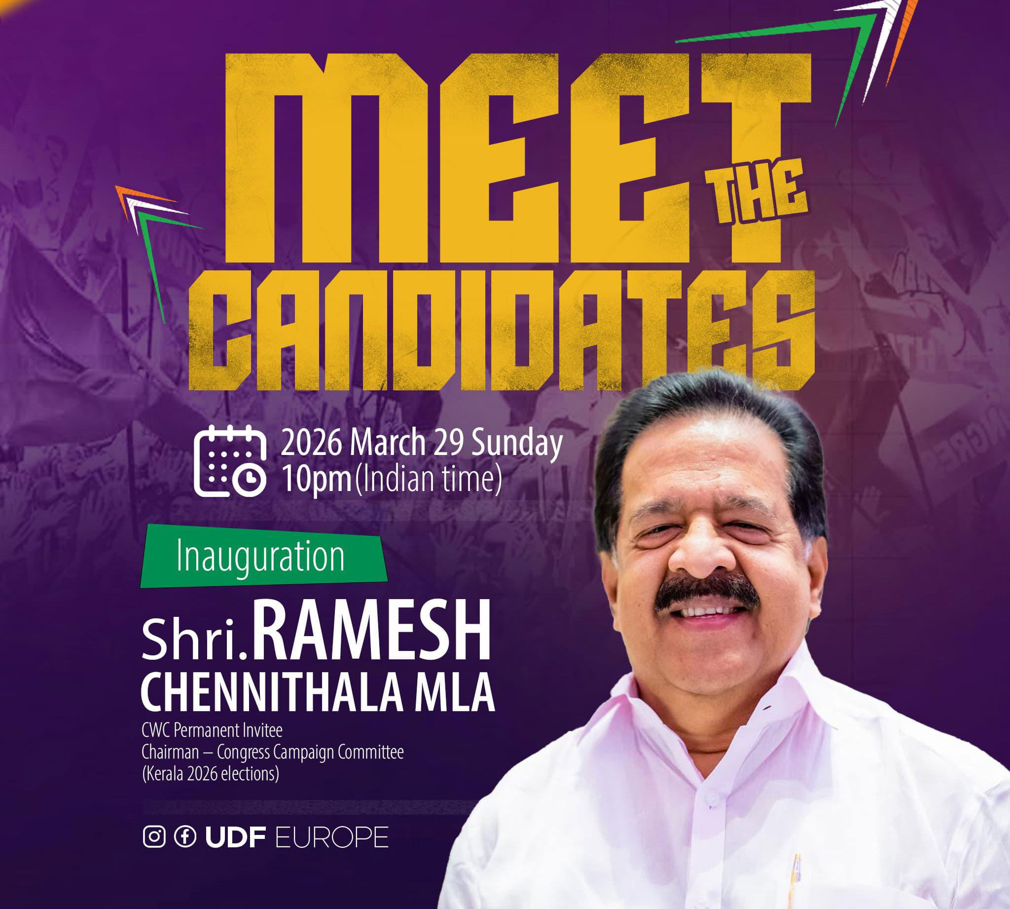 യൂറോപ്പ്: കേരള നിയമസഭ തെരഞ്ഞെടുപ്പിനോടനുബന്ധിച്ച് പ്രവാസി സമൂഹത്തെ സജീവമായി ഉൾപ്പെടുത്തുന്നതിന്റെ ഭാഗമായി യു ഡിഎഫ് യൂറോപ്പ് സംഘടിപ്പിക്കുന്ന ‘മീറ്റ് ദ കാൻഡിഡേറ്റ്’ പരിപാടി ഈ വരുന്ന ഞായറാഴ്ച (29/03/2026) ഇന്ത്യൻ സമയം രാത്രി 10ന് നടക്കും. യുകെ സമയം വൈകിട്ട് 4.30നും യൂറോപ്പ് സമയം വൈകിട്ട് 5.30നും ആരംഭിക്കുന്ന പരിപാടി ഓൺലൈൻ പ്ലാറ്റ്ഫോമായ സൂം വഴി സംഘടിപ്പിക്കപ്പെടും.