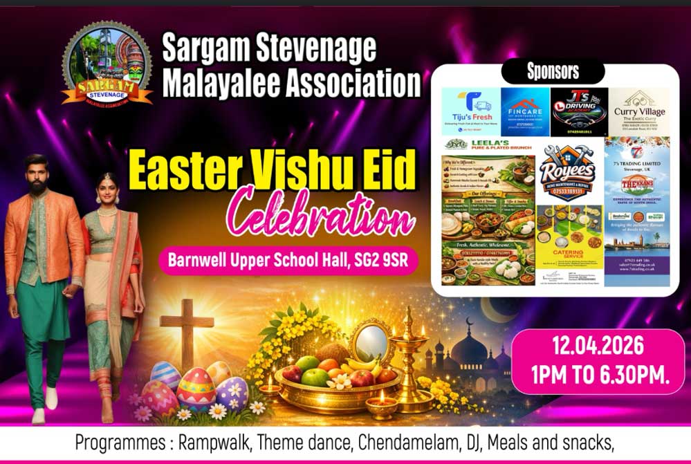 പുതിയ കമ്മിറ്റിയുടെ നേതൃത്വത്തിൽ ഈസ്റ്റർ-വിഷു-ഈദ് ആഘോഷം പ്രൗഢവും, വിപുലമായും സംഘടിപ്പിക്കും. റാമ്പ് വാക്, ഫെസ്റ്റിവൽ തീം സ്കിറ്റ്സ്, ഡിജെ, ഗ്രാൻഡ് ഈസ്റ്റർ ഡിന്നർ, ശിങ്കാരി മേളം കൂടാതെ കലയുടെ വർണ്ണ വസന്തം വിടരുന്ന സംഗീത-നൃത്ത-നടന വിരുന്നും ആസ്വദിക്കാം ഏപ്രിൽ 12 ന് ഞായറാഴ്ച്ച സംഘടിപ്പിക്കുന്ന ഈസ്റ്റർ , വിഷു ആഘോഷത്തിന് സ്റ്റീവനേജ് ബാൺവെൽ അപ്പർ സ്കൂൾ ഓഡിറ്റോറിയം വേദിയാവും.