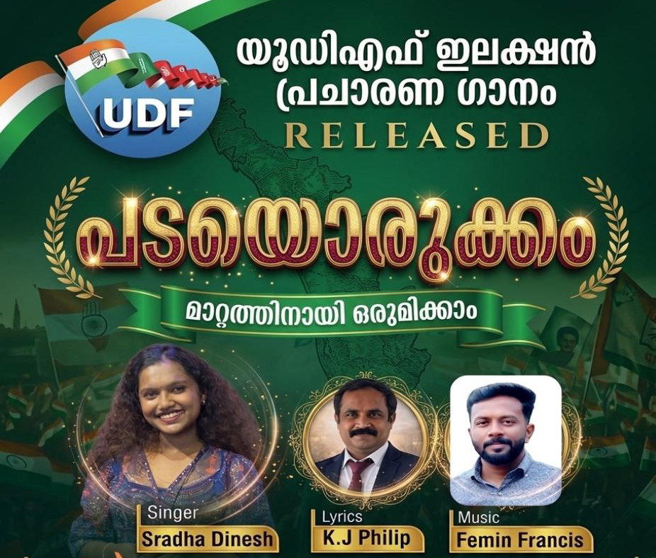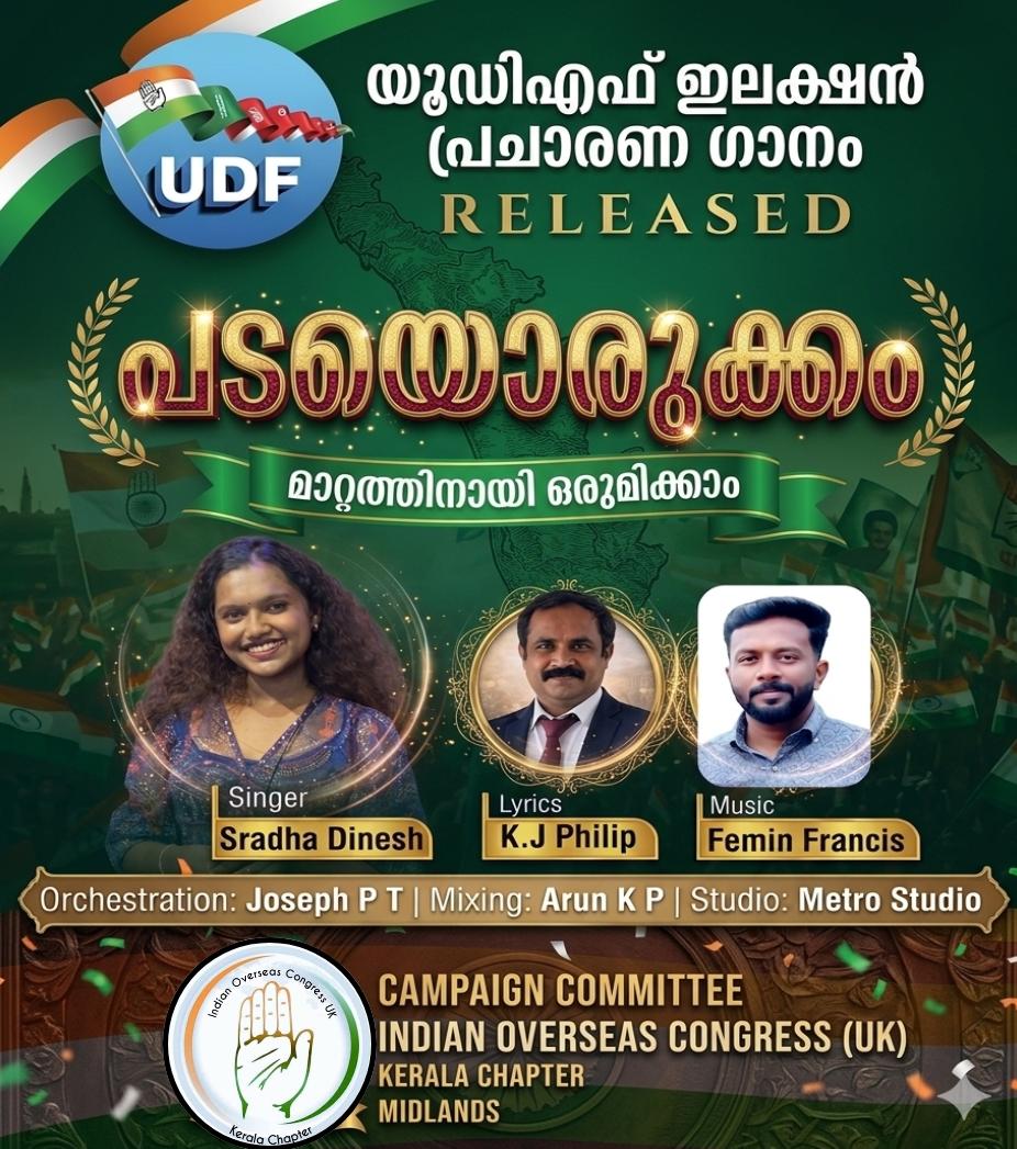 മിഡ്ലാന്ഡ്സ് : കേരള നിയമസഭ തെരഞ്ഞെടുപ്പിനെ മുന്നില്ക്കണ്ട് യു ഡി എഫ് സ്ഥാനാര്ഥികളുടെ വിജയത്തിനായി ഇന്ത്യന് ഓവര്സീസ് കോണ്ഗ്രസ് (യുകെ) കേരള ചാപ്റ്റര് മിഡ്ലാന്ഡ്സ് ക്യാമ്പയിന് കമ്മിറ്റി തയ്യാറാക്കിയ പ്രചാരണ വീഡിയോ ഗാനം പുറത്തിറങ്ങി. ''പടയൊരുക്കം - മാറ്റത്തിനായി ഒരുമിക്കാം'' എന്ന ആശയവുമായി പുറത്തിറങ്ങിയ ഈ ഗാനം സോഷ്യല് മീഡിയ പ്ലാറ്റ്ഫോമുകളില് ഇതിനോടകം ശ്രദ്ധ നേടിക്കഴിഞ്ഞു.