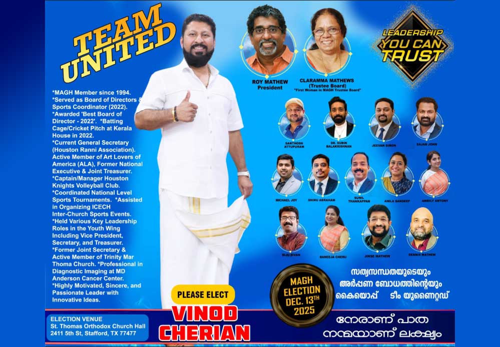 ഹൂസ്റ്റൺ: ഗ്രേറ്റർ ഹൂസ്റ്റൺ മലയാളി അസോസിയേഷന്റെ (MAGH) 2026-ലേക്കുള്ള ഭരണസമിതി തിരഞ്ഞെടുപ്പിൽ, റോയ് മാത്യു നയിക്കുന്ന 'ടീം യുണൈറ്റഡ്' (Team United) പാനലിൽ നിന്ന് പ്രമുഖ സാമൂഹ്യ-കായിക സംഘാടകനായ വിനോദ് ചെറിയാൻ ജനവിധി തേടുന്നു.