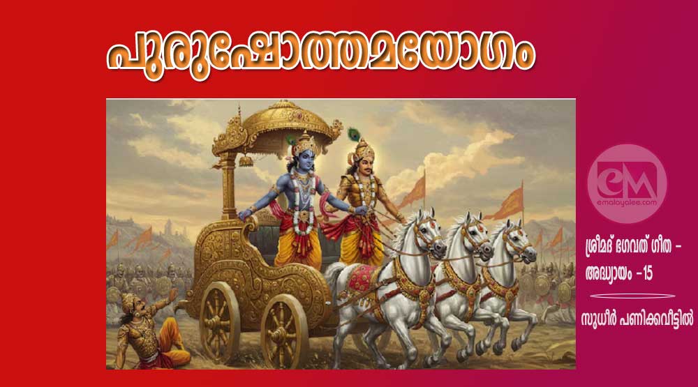 ഈ ലോകത്തെ നിലനിറുത്തുന്നു. അത് പരമാത്മാവ് എന്നറിയപ്പെടുന്നു . ഞാൻ ക്ഷരങ്ങളെ അതിക്രമിച്ചവനാകയാൽ ഞാൻ അക്ഷരപുരുഷനെക്കാളും ഉത്തമനാണ്. അതിനാൽ ഈ ലോകത്തിലും വേദങ്ങളിലും ഞാൻ പുരുഷോത്തമൻ എന്നറിയപ്പെടുന്നു.