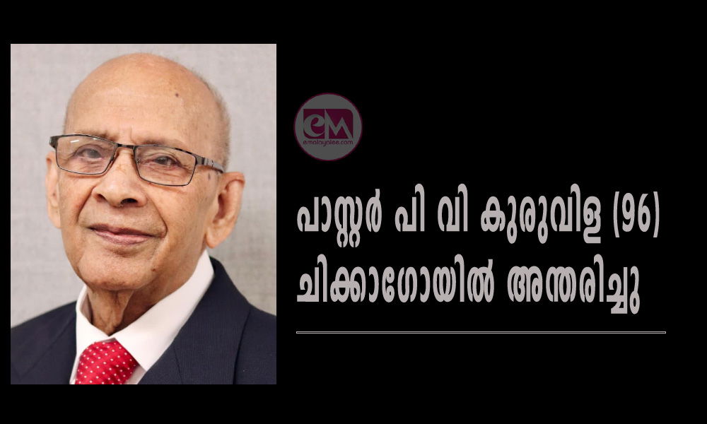 ചിക്കാഗോ: ശാരോൻ ഫെലോഷിപ്പ് ചർച്ചിന്റെ സീനിയർ ശുശ്രൂഷകനും സഭയുടെ മുൻ ജനറൽ സെക്രട്ടറിയുമായിരുന്ന പാസ്റ്റർ പി വി കുരുവിള (96) ചിക്കാഗോയിൽ അന്തരിച്ചു.