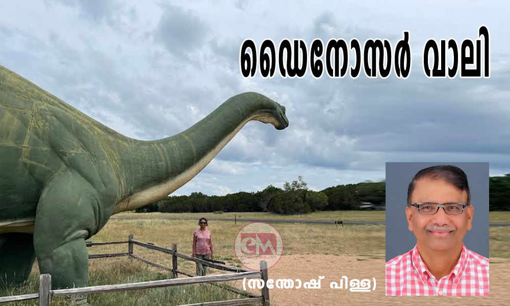 അമേരിക്കയിലെ ടെക്സസ് സംസ്ഥാനത്തിലെ ഒരു പട്ടണമായ, ഡാലസിൽ നിന്നും 85 മൈൽ ദൂരത്തിലുള്ള സ്റ്റേറ്റ് പാർക്ക് ആണ് ഡൈനോസർ വാലി. അവിടെ എത്തിച്ചേർന്നപ്പോൾ വളരെ പുരാതനമായ ഒരുപ്രദേശത്ത് എത്തിച്ചേർന്ന പ്രതീതി. പാലക്സി നദി യെന്ന വിളിപ്പേരുള്ള, വേനൽക്കാലത്ത്, ഒരു തോടുപോലെ കാണപ്പെടുന്ന ജലവാഹിനിക്കടിയിലും, ഓരങ്ങളിലുമാണ് ഡൈനോസറുകളുടെ കാൽപാദങ്ങൾ തെളിഞ്ഞു കാണുന്നത്. 1050- 1130 ലക്ഷം വർഷങ്ങൾക്ക് മുമ്പ് ജീവിച്ചിരുന്ന അക്രോകാന്തോസോറസ്സിന്റെയും, ബ്രോൺടോ സോറസ്സുകളുടെയും കാൽപാദങ്ങ ളാണ് നദീതീരത്തും, അടിത്തട്ടിലും, ഇപ്പോഴും കാണാൻ സാധിക്കുന്ന ത്.
