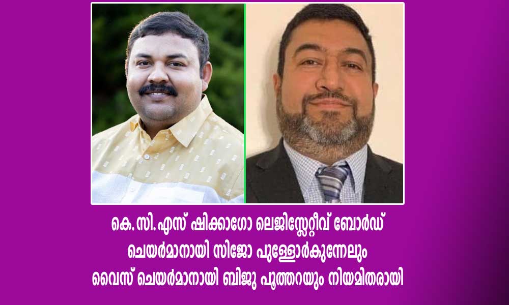 കെ.സി.എസ് പ്രവർത്തനങ്ങൾക്ക് ശക്തമായ അടിത്തറ നൽകി വരുന്ന ലെജിസ്ലേറ്റീവ് ബോർഡിൻ്റെ പ്രവർത്തനങ്ങൾക്ക് നേതൃത്വം നൽകുവാൻ മുന്നോട്ട് വന്നിരിക്കുന്ന സിജോ പുള്ളോർകുന്നേലിനും, ബിജു പൂത്തുറയിലിനും, കെ.സി.എസ് ഷിക്കാഗോ ഹൃദയംഗമമായ അഭിനന്ദനങ്ങളും ആശംസകളും നേരുന്നു.