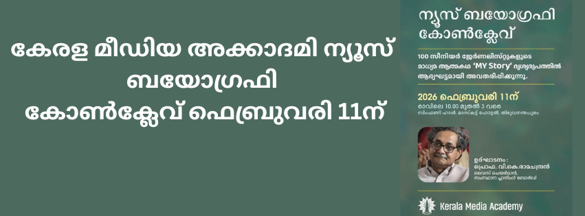 കേരള മീഡിയ അക്കാദമി ന്യൂസ് ബയോഗ്രഫി കോൺക്ലേവ് ഫെബ്രുവരി 11ന് രാവിലെ 10.00 മുതൽ മാസ്കോട്ട് ഹോട്ടലിലെ സിംഫണി ഹാളിൽ സംഘടിപ്പിക്കുന്നു.