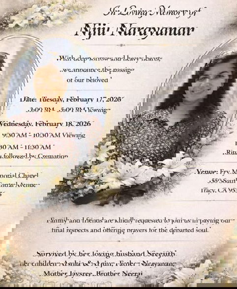 Niju Narayanan passed away recently after bravely fighting Stage IV breast cancer. Known for her strength and determination, Niju leaves behind her loving husband Sreejith Sivan and two children, Arshia and Arjun, who are now navigating this difficult time.