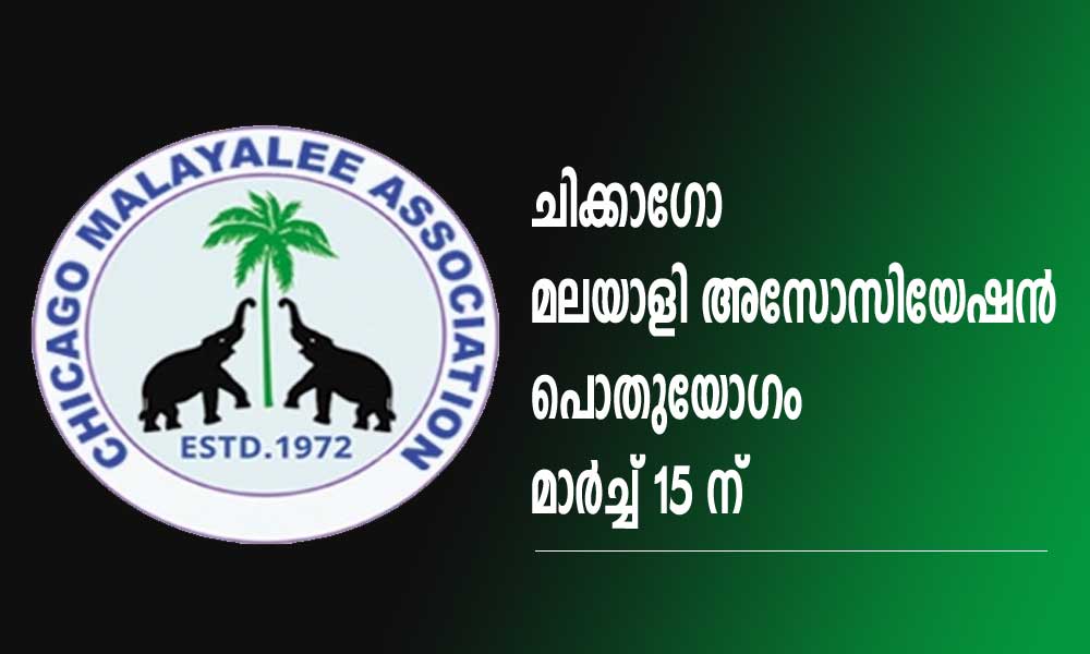 ചിക്കാഗോ:ചിക്കാഗോ മലയാളി അസോസിയേഷന്റെ ഒരു സാധാരണ യോഗം 2026 മാർച്ച് മാസം 15ന് വൈകിട്ട് നാലിന് അസോസിയേഷൻ ഹാളിൽ വച്ച് നടത്തപ്പെടുന്നതാണ് .ഈ മീറ്റിംഗിലേക്ക് എല്ലാ അസോസിയേഷൻ അംഗങ്ങളെയും ക്ഷണിക്കുന്നതായി ഭാരവാഹികൾ അറിയിച്ചു .