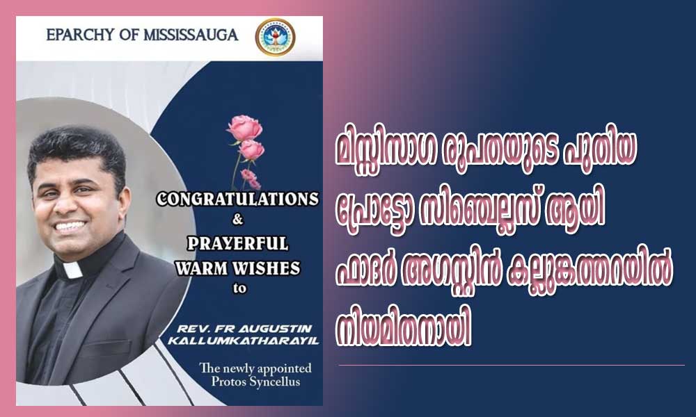 മിസ്സിസാഗ: മിസ്സിസാഗ രൂപതയുടെ പ്രോട്ടോ സിഞ്ചെല്ലസ് ആയി ഫാദർ അഗസ്റ്റിൻ കല്ലുങ്കത്തറയിൽ നിയമിതനായി. 2019 മുതൽ സേവനമനുഷ്ഠിച്ചിരുന്ന ഫാദർ പത്രോസ് ചമ്പക്കര കാനഡയിലെ സേവനം പൂർത്തിയാക്കി അമേരിക്കയിലേക്ക് പോകുന്ന സാഹചര്യത്തിലാണ് ഈ പുതിയ നിയമനം.