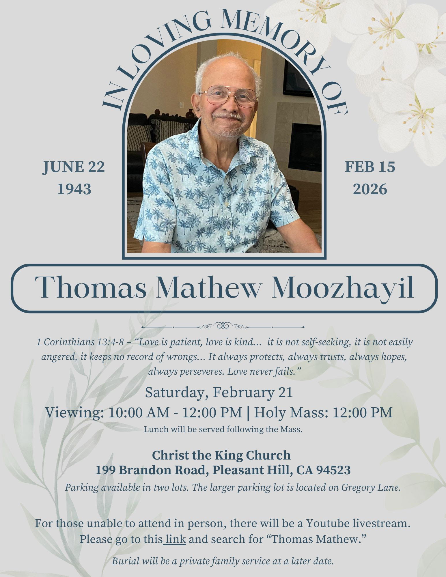 പൊതുദർശനം: ഫെബ്രുവരി 21 ശനിയാഴ്ച രാവിലെ 10:00 മുതൽ ഉച്ചയ്ക്ക് 12:00 വരെ