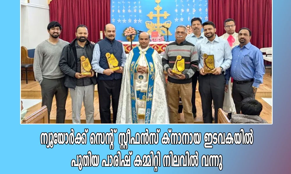 ന്യൂയോർക്ക്: ന്യൂയോർക്ക് സെന്റ് സ്റ്റീഫൻസ് ക്നാനായ കത്തോലിക്കാ ഇടവകയിൽ 2026-2027 പ്രവർത്തന വർഷത്തേക്കുള്ള പുതിയ പാരിഷ് കമ്മിറ്റി ഫെബ്രുവരി 8-ന് ചുമതലയേറ്റു. കൈക്കാരന്മാരായി (Trustees) അബ്രഹാം (എബി) തേർവാലകട്ടയിൽ, ജെയിംസ് നികർത്തിൽ, ജെയിംസ് പുള്ളോർകുന്നേൽ, നോയൽ കുഴിപറമ്പിൽ എന്നിവർ സ്ഥാനമേറ്റു. പാരിഷ് കൗൺസിൽ സെക്രട്ടറി ആയി ജെന്നി പാറ്റിയാലിയും ചുമതലയേറ്റു.