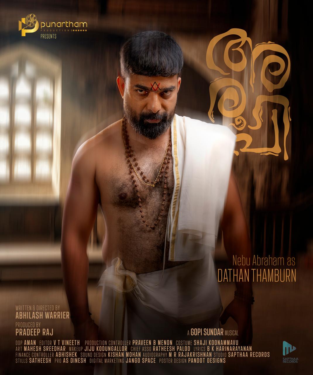 പുണര്തം പ്രൊഡക്ഷന്സിന്റെ ബാനറില് പ്രദീപ് രാജ് നിര്മിച്ച് അഭിലാഷ് വാരിയര് തിരക്കഥയെഴുതി സംവിധാനം ചെയ്യുന്ന 'അരൂപി' എന്ന ചിത്രത്തില് നെബു ഏബ്രഹാം അവതരിപ്പിക്കുന്ന ദത്തന് നമ്പൂതിരി എന്ന കഥാപാത്രത്തിന്റെ പോസ്റ്റര് റിലീസായി.