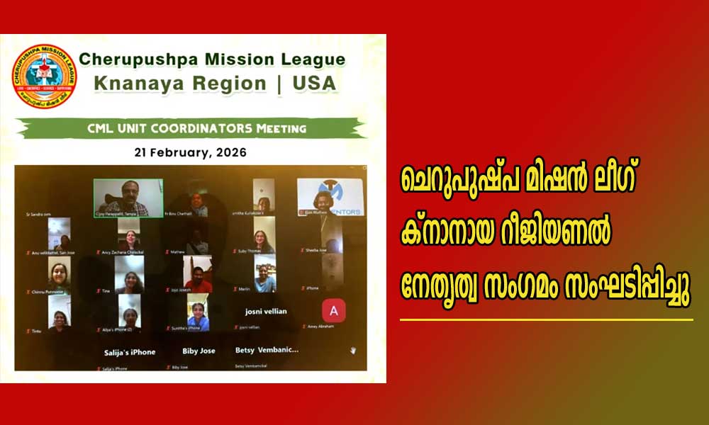 ചിക്കാഗോ: ചെറുപുഷ്പ മിഷന് ലീഗ് ക്നാനായ റീജിയണല് നേതൃത്വ സംഗമം സംഘടിപ്പിച്ചു. മിഷന് ലീഗ് റീജിയണല് ഡയറക്ടര് ഫാ. ബിന്സ് ചേത്തലില്, അന്തര്ദേശീയ റീജിയണല് ഓര്ഗനൈസര് സിജോയ് പറപ്പള്ളില് എന്നിവര് ചര്ച്ചകള്ക്ക് നേതൃത്വം നല്കി സംസാരിച്ചു.