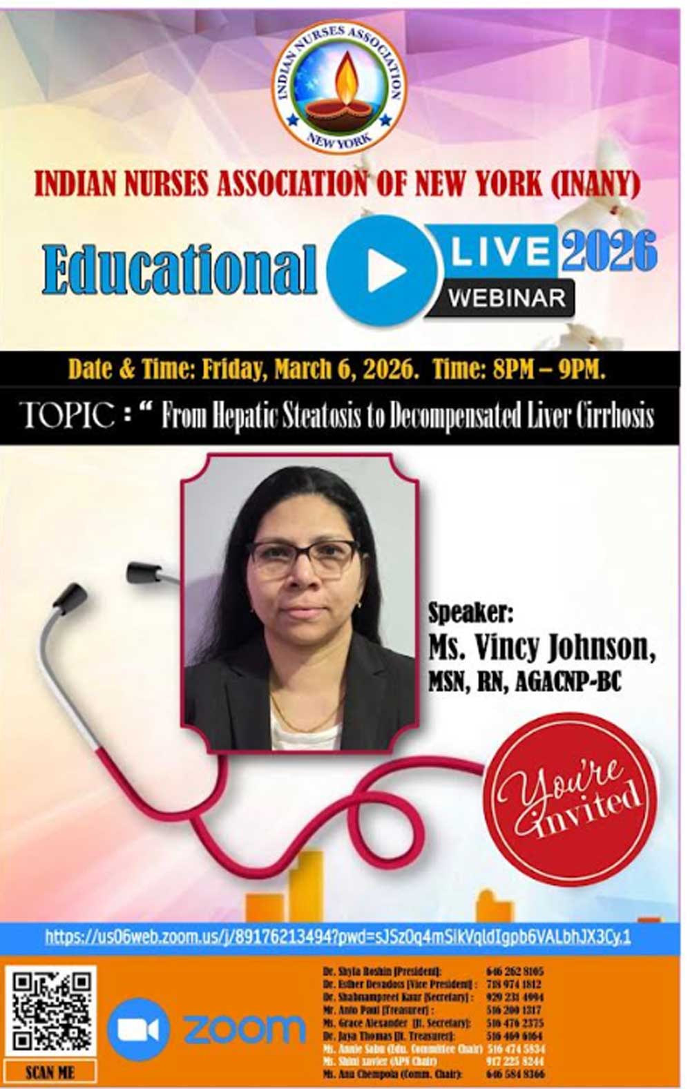 ഓരോ വർഷവും നടപ്പിലാക്കിയ പദ്ധതികൾ കൊണ്ട് സാമൂഹികാരോഗ്യ രംഗത് മുന്നിൽ നിൽക്കുന്ന ഇന്ത്യൻ നഴ്സസ് അസോസിയേഷൻ ഓഫ് ന്യൂ യോർക്ക് (ഐനാനി), രജിസ്റ്റേർഡ് നഴ്സുമാർക്കായി മാർച്ച് ആറാം തിയതി, വെള്ളിയാഴ്ച വൈകീട്ട് എട്ടു മുതൽ ഒൻപതു വരെ, തുടർ വിദ്യാഭ്യാസ വെബ്ബിനാർ നടത്തുന്നു. അമേരിക്കൻ നഴ്സസ് ക്രെഡന്ഷ്യലിംഗ് സെന്റർ അംഗീകരിച്ചിട്ടുള്ള ഒരു മണിക്കൂർ തുടർ വിദ്യാഭ്യാസ ക്രെഡിറ്റ്, പങ്കെടുക്കുന്ന നഴ്സുമാർക്ക് സൗജന്യമായി ലഭിക്കും.