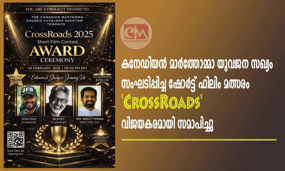 ടൊറൊന്റോ: കനേഡിയൻ മാർത്തോമ്മാ യുവജന സഖ്യം സംഘടിപ്പിച്ച ഷോർട്ട് ഫിലിം മത്സരം “CrossRoads” വിജയകരമായി സമാപിച്ചു. അമേരിക്കയുടെയും കാനഡയുടെയും വിവിധ ഭാഗങ്ങളിൽ നിന്നുള്ള 12 മാർത്തോമ്മാ പള്ളികൾ മത്സരത്തിൽ പങ്കെടുത്തു. യുവജനങ്ങളുടെ സൃഷ്ടിപരമായ ചിന്തയും ആത്മീയ സന്ദേശവും കലാത്മക മികവും ഓരോ ചിത്രത്തിലും വ്യക്തമായി പ്രതിഫലിച്ചു.