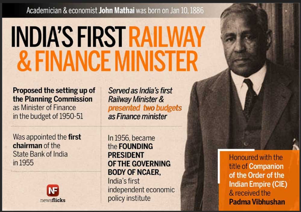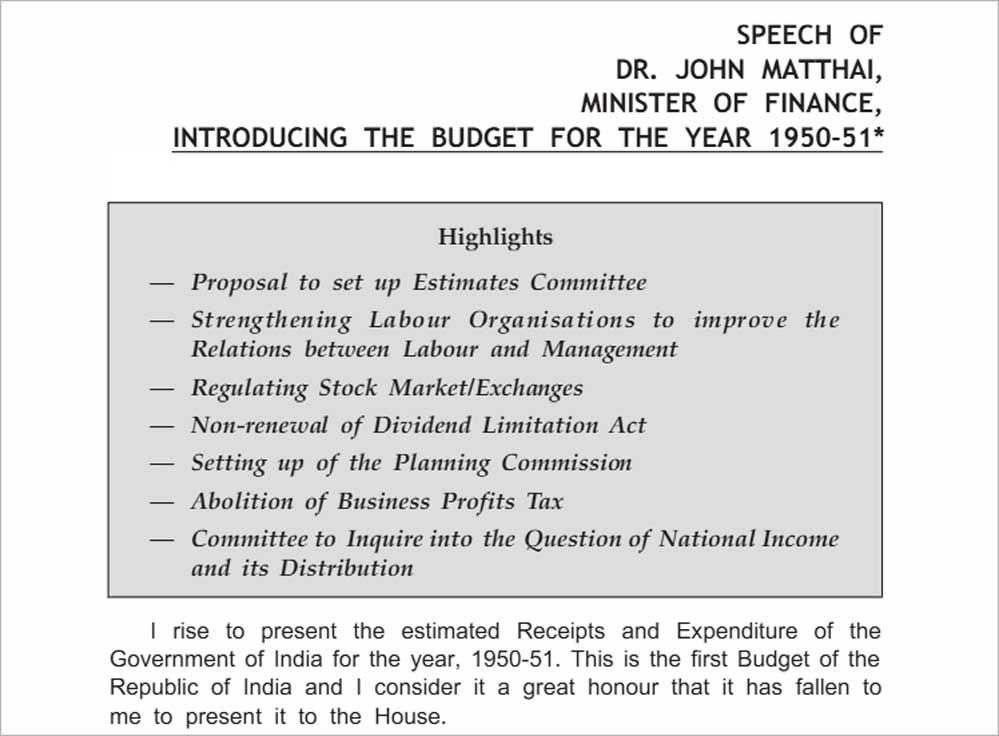 റിപ്പബ്ലിക്ക് ഓഫ് ഇന്ത്യയുടെ ആദ്യ ധനകാര്യ ബജറ്റ് അവതരിപ്പിച്ചത് ഡോ. ജോൺ മത്തായി ആയിരുന്നു. 76 വർഷങ്ങൾക്കുമുൻപ് ഫെബ്രുവരി 28, 1950. സ്വാതന്ത്ര്യത്തിനു ശേഷമുള്ള ഇന്ത്യയുടെ ആദ്യ ബജറ്റ് 1947 നവംബർ 26 ന് ധനമന്ത്രി ആർ.കെ. ഷൺമുഖം ചെട്ടി അവതരിപ്പിച്ചു. വിവാദപരമായ സാഹചര്യങ്ങളിൽ അദ്ദേഹം ഇന്ത്യയുടെ ധനമന്ത്രി സ്ഥാനം രാജിവച്ചു. സ്വതത്ര ഇന്ത്യയുടെ ആദ്യ റെയിൽവേ ആൻഡ് ട്രാസ്പോർട് മന്ത്രി ആയിരുന്ന ഡോ. ജോൺ മത്തായി ധനകാര്യ വകുപ്പ് മന്ത്രിയായി ചുമതലയേൽക്കുകയായിരുന്നു. പ്രസംഗത്തിന്റെ പൂർണ്ണരൂപം സൈറ്റിൽ ഉണ്ട്. പ്രധാനപ്പെട്ട ആശയങ്ങൾ കുറിക്കുന്നു.