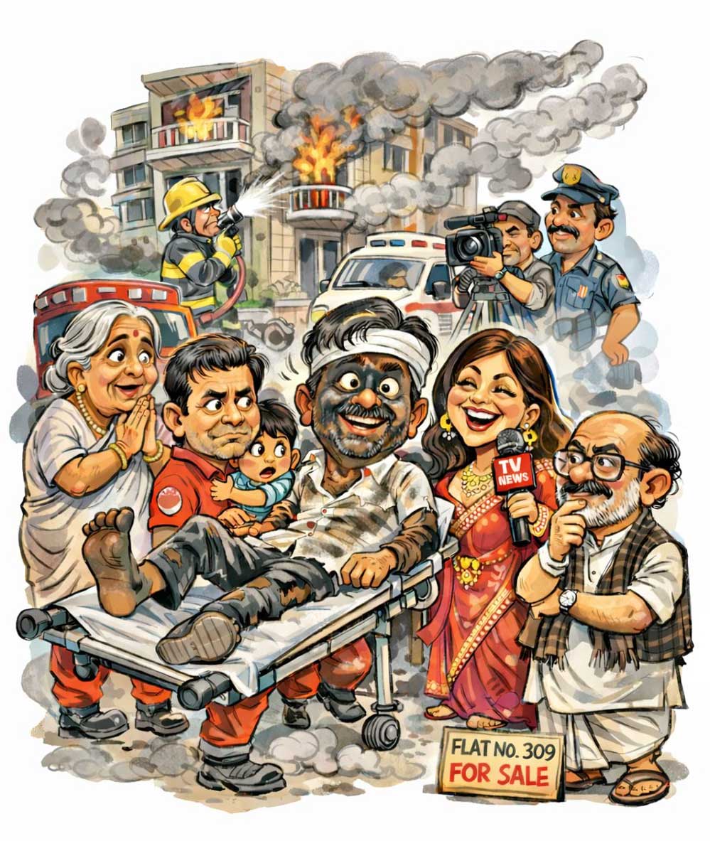 തീയണഞ്ഞതുകൊണ്ട് . ചാനലുകാർ ഉടൻതന്നെ നിരാശരായി കട്ടേം പടോം മടക്കി സ്ഥലം വിട്ടു. അതോടു കൂടി പരദൂഷണം മതിയാക്കി, അന്തേവാസികളും ഓരോരുത്തരായി അവരവരുടെ ഫ്ളാറ്റിലേ ക്കു തിരിച്ചുപോയി .