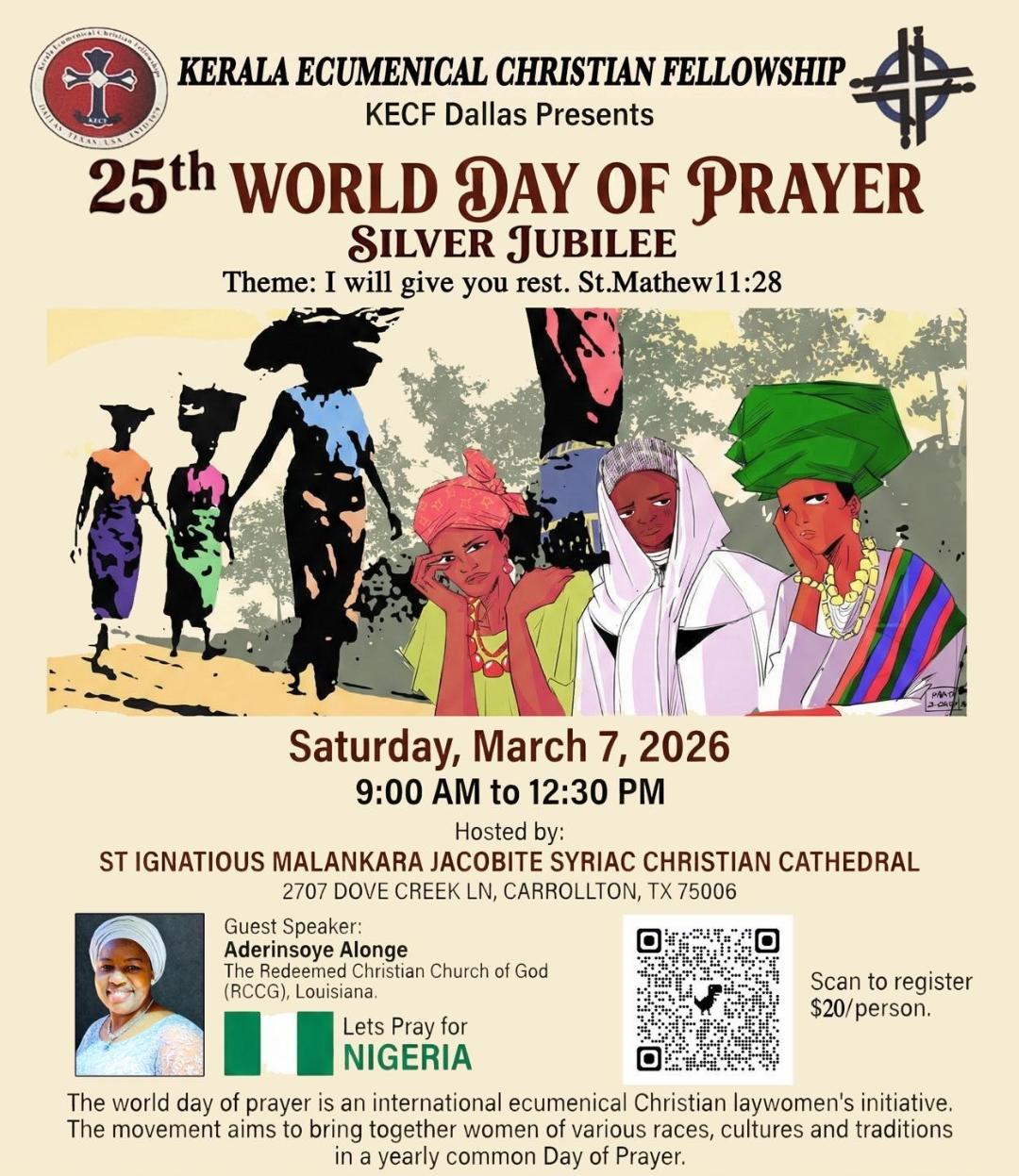 കേരള എക്യൂമിനിക്കല് ക്രിസത്യന് ഫെലോഷിപ്പ് ഡാളസിന്റെ, ആഭിമുഖ്യത്തില് വര്ഷം തോറും നടത്തിവരാറുള്ള വേള്ഡ് ഡേ ഓഫ് പ്രെയറിന്റെ 25-ാമത് വാര്ഷീകാഘോഷം(സില്വര് ജൂബിലി) 2026 മാര്ച്ച് മാസം 7-ാം തീയതി 9(ശനിയാഴ്ച) ഡാളസ് സെന്റ് ഇഗ്നേഷ്യസ് കത്തീഡ്രലില് വെച്ച് സമുചിതമായി നടത്തപ്പെട്ടു.
