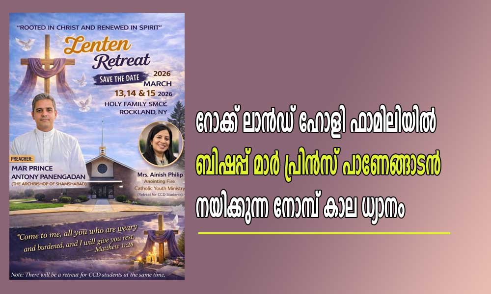 ന്യൂ യോർക്ക് : പ്രശസ്ത വചന പ്രഘോഷകനും ധ്യാന ഗുരുവും ഷംഷാബാദ് അതി രൂപതധ്യക്ഷനുമായ മാർ ആന്റണി പ്രിൻസ് പാണേങ്ങാടൻ നയിക്കുന്ന വാർഷിക ധ്യാനം റോക്ക്ലാൻഡ് ഹോളി ഫാമിലി സീറോ മലബാർ പള്ളിയിൽ മാർച്ച് 13,14,15 തീയതികളിൽ നടത്തപ്പെടുന്നു.