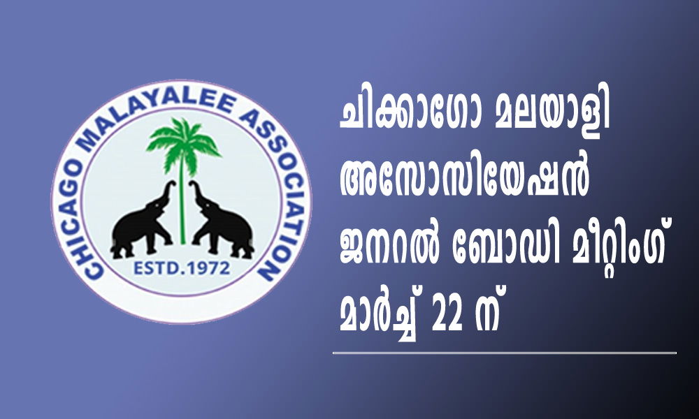 ചിക്കാഗോ : മാർച്ച് മാസം 15 ഞായറാഴ്ച വൈകുന്നേരം 4ന് നടത്താനിരുന്ന ചിക്കാഗോ മലയാളി അസോസിയേഷന്റെ ജനറൽ ബോഡി മീറ്റിംഗ് മാർച്ച് 22 ഞായറാഴ്ചയിലേക്ക് മാറ്റി വെച്ച വിവരം അറിയിക്കുന്നു .