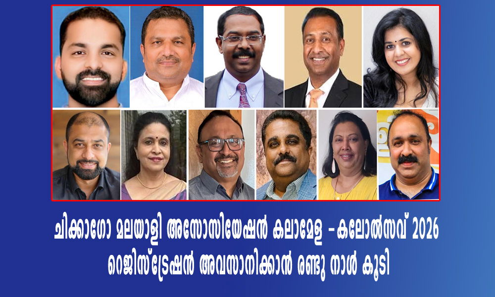 ചിക്കാഗോ : ചിക്കാഗോ മലയാളി അസോസിയേഷന്റെ ഏറ്റവും ജനപങ്കാളിത്തമുള്ള പരിപാടികളിൽ ഒന്നായ കലാമേളയുടെ രെജിസ്ട്രേഷൻ അവസാനിക്കാൻ ഇനി രണ്ടു ദിവസം കൂടി മാത്രം .കലാമേളയുടെ രെജിസ്ട്രേഷൻ ഈ വെള്ളിയാഴ്ച (2026 മാർച്ച് 20) അവസാനിക്കും .ഇത്തവണ അസോസിയേഷന്റെ ചരിത്രത്തിലെ ഏറ്റവുമധികം മത്സരാർത്ഥികൾ പങ്കെടുക്കുന്ന ഒരു കലാമേളയായിരിക്കുമെന്നാണ് തങ്ങൾ പ്രതീക്ഷിക്കുന്നതെന്ന് ചിക്കാഗോ മലയാളീ അസോസിയേഷൻ പ്രസിഡണ്ട് ജോസ് മണക്കാട്ട് ,ജനറൽ സെക്രട്ടറി ബിജു മുണ്ടക്കൽ ,ട്രെഷറർ അച്ചൻകുഞ്ഞ് മാത്യു ,വൈസ് പ്രസിഡണ്ട് ലൂക്ക് ചിറയിൽ,ജോയിന്റ് സെക്രട്ടറി സാറ അനിൽ ,ജോയിന്റ് ട്രെഷറർ പ്രിൻസ് ഈപ്പൻ,കലാമേള ചെയർ പേഴ്സൺ ഷൈനി ഹരിദാസ്,കോ ചെയർസ് ജോജോ വെങ്ങാന്തറ , മാത്യൂസ് എബ്രഹാം എന്നിവർ അറിയിച്ചു .