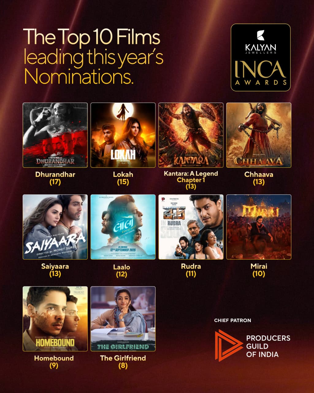ഈ വര്ഷം ഏറ്റവും കൂടുതല് നാമനിര്ദ്ദേശങ്ങള് നേടിയ ചിത്രങ്ങളില് ധുരന്ധര് (17), ലോക: ചാപ്റ്റര് വണ് (15), കാന്താര: ചാപ്റ്റര് 1 (13), ഛാവാ (13), സയ്യാറ (13), ലാലോ (12), റുദ്ര (11), മിറായ് (10), ഹോംബൗണ്ട് (9), ദ ഗേള്ഫ്രണ്ട് (8) എന്നിവ മുന്പന്തിയിലാണ്.