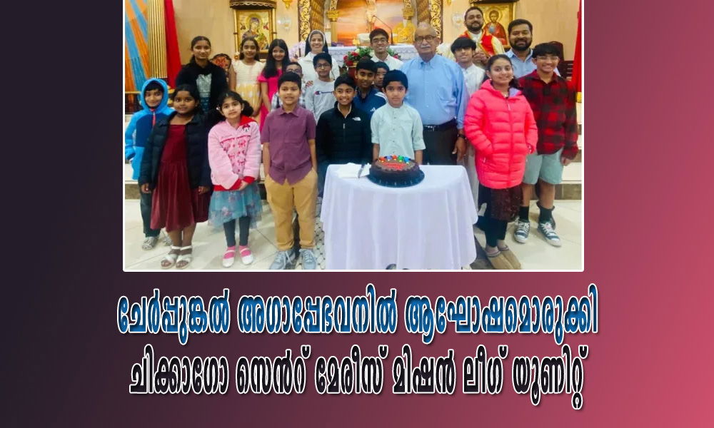 ചിക്കാഗോ: ചിക്കാഗോ സെന്റ് മേരീസ് ക്നാനായ കത്തോലിക്കാ ദേവാലയത്തിലെ ചെറുപുഷ്പ മിഷൻ ലീഗ് യൂണിറ്റിന്റെ ആഭിമുഖ്യത്തിൽ ചേർപ്പുങ്കൽ അഗാപ്പഭവനിലെയും ഗുഡ് സമിരിറ്റൻ റിസോഴ്സ് സെന്ററിലെയും തൊഴിൽപരമായ പരിശീലനം നേടുന്ന അന്ധരും ബധിരരുമായ ഏകദേശം 45ഓളം ഭിന്നശേഷിയുള്ള കുട്ടികൾക്കായി വാർഷിക ജന്മദിനാഘോഷം സംഘടിപ്പിച്ചു. ഇടവകയിലെ മിഷൻ ലീഗ് യൂണിറ്റ് മാസങ്ങളായി നടത്തിവരുന്ന “Share with Joy, Pray with Care” എന്ന ജന്മദിന ചാരിറ്റി പദ്ധതിയുടെ ഭാഗമായാണ് ഈ ആഘോഷം സംഘടിപ്പിച്ചത്. കോട്ടയം അതിരൂപത മിഷൻ ലീഗ് ചാപ്ലിൻ ഫാ. ഫാ. ജെഫിൻ ഉഴുങ്ങാലിയുടെ നേതൃത്വത്തിലാണ് അഗാപ്പേ ഭവനിലെ പരിപാടികൾ ക്രമീകരിച്ചത്. വാർഷിക ജന്മദിനാഘോഷത്തിന്റെ ഭാഗമായി കുട്ടികളുടെ പ്രതിനിധിയും സെന്റ് മേരീസ് ക്നാനായ കത്തോലിക്കാ ദേവാലയത്തിലെ കൈക്കാരൻ സണ്ണി കണ്ണാലയും ഫാ. ജെഫിൻ ഉഴുങ്ങാലിയും ഒരുമിച്ച് ചേർന്ന് കേക്ക് മുറിച്ച് കുട്ടികൾക്ക് വിതരണം ചെയ്തു. ആഘോഷത്തിന്റെ ഭാഗമായി വിഭവസമൃദ്ധമായ ഉച്ചഭക്ഷണവും എല്ലാ കുട്ടികൾക്കും ജന്മദിന സമ്മാനങ്ങളും ഒരുക്കിയിരുന്നു. ഈ പദ്ധതിയുമായി ബന്ധപ്പെട്ട Prayer Dedication മാർച്ച് 22-ന് ചിക്കാഗോ സെന്റ് മേരീസ് ക്നാനായ കത്തോലിക്കാ ദേവാലയത്തിൽ ഇടവക വികാരി ഫാദർ സിജു മുടക്കോടിയിൽ കുട്ടികളുടെ വിശുദ്ധ കുർബാനയ്ക്കുശേഷം നിർവഹിച്ചു. ഈ പ്രാർത്ഥന ശുശ്രൂഷയിൽ മാർച്ച് മാസത്തിൽ ജന്മദിനം ആഘോഷിക്കുന്ന ഇടവകാംഗങ്ങളെയും അഗാപ്പേ ഭവനിലെ എല്ലാ കുട്ടികളെയും പ്രത്യേകമായി അനുസ്മരിച്ചു. ഇടവകയിലെ മിഷൻ ലീഗ് യൂണിറ്റ് സ്പിരിച്ചൽ ഡയറക്ടർ ഫാദർ അനീഷ് മാവേലി പുത്തൻപുരയിലും സന്നിഹിതനായിരുന്നു.