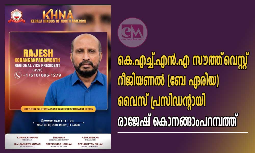 സാൻ ഫ്രാൻസിസ്കോ : നോർത്ത് അമേരിക്കയിലെ മലയാളി ഹിന്ദുക്കളുടെ ദേശീയ സംഘടനയായ Kerala Hindus of North America (KHNA)യുടെ സൗത്ത്വെസ്റ്റ് റീജിയണൽ വൈസ് പ്രസിഡന്റായി (RVP) രാജേഷ് കൊനങ്ങാംപറമ്പത്തിനെ നിയമിച്ചു. സാൻ ഫ്രാൻസിസ്കോ ഉൾപ്പെടുന്ന നോർതേൺ കാലിഫോർണിയ മേഖലയിൽ സംഘടനയുടെ പ്രവർത്തനങ്ങൾ ഏകോപിപ്പിക്കുകയും സാമൂഹിക–സാംസ്കാരിക പദ്ധതികൾക്ക് നേതൃത്വം നൽകുകയും ചെയ്യുന്നതാണ് അദ്ദേഹത്തിന്റെ പ്രധാന ചുമതല.
