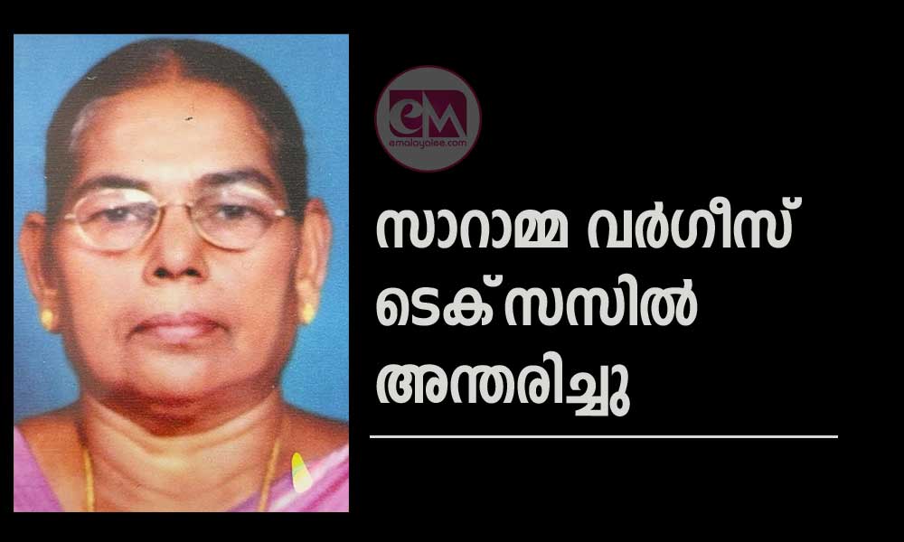 ഡാളസ് : പരേതനായ പി. ടി. വറുഗീസിന്റെ (മൈലപ്ര) ഭാര്യ സാറാമ്മ വറുഗീസ് ഡാളസിൽ അന്തരിച്ചു. മുംബൈയിലും പത്തനംതിട്ടയിലെ പൊൻമുടിയിലും ഡാളസിലും ഏറെ കർമ്മനിരതയായിരുന്നു.