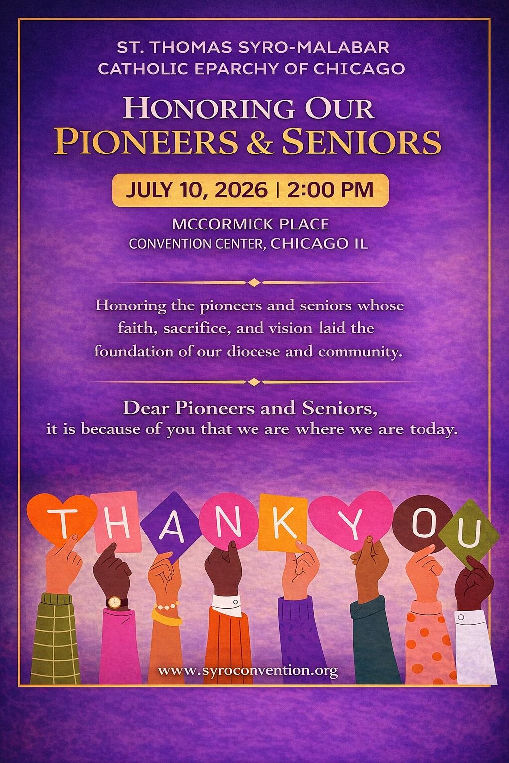 ഷിക്കാഗോ സീറോ മലബാര് രൂപതയുടെ സില്വര് ജൂബിലി ആഘോഷങ്ങളുടെ സമാപനത്തോടനുബന്ധിച്ച് 2026 ജൂലൈ 9, 10, 11, 12 തീയതികളില് ഷിക്കാഗോയിലെ മക്കോര്മിക് പ്ലേസ് കണ്വന്ഷന് സെന്ററില് വെച്ച് നടക്കുന്ന സീറോ മലബാര് കണ്വന്ഷനിലാണ് ഈ സംഗമം.